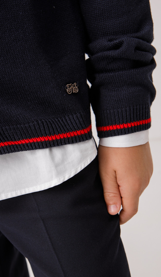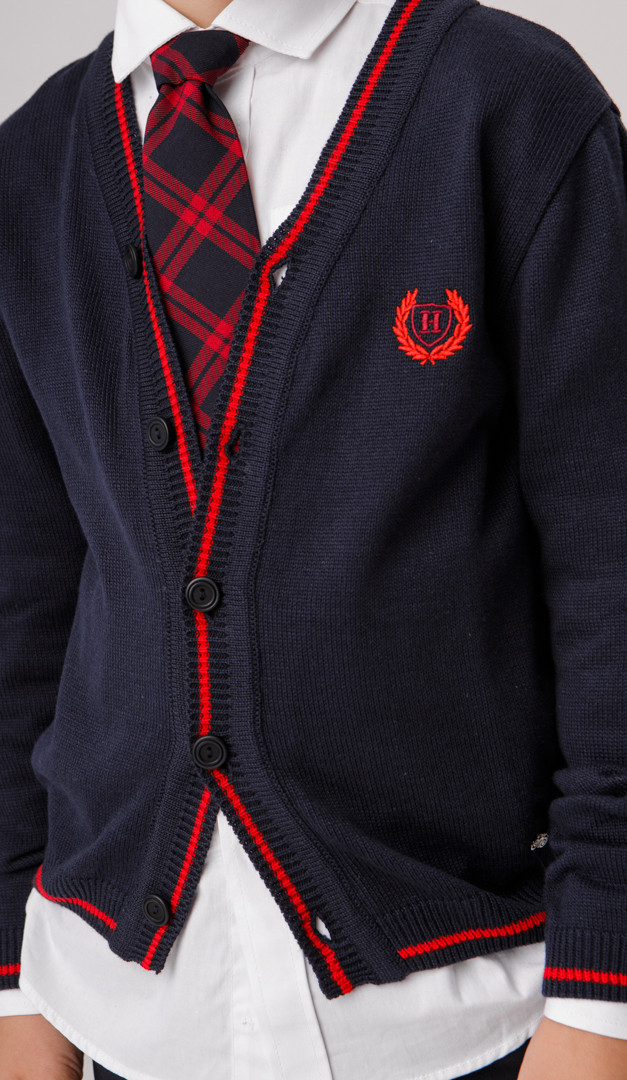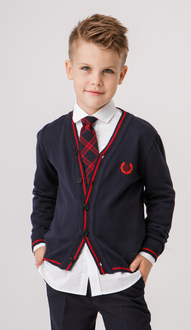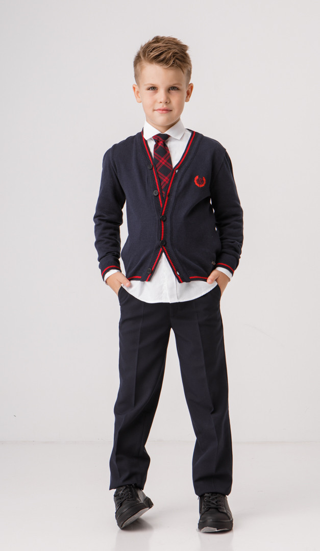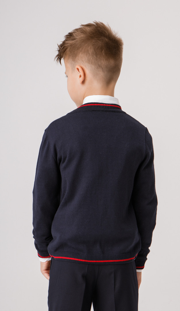 Стильная трикотажная кофта cиняя с красным кантом для мальчиков школьного возраста. Модель выполнена с V-образным вырезом горловины, плавно переходящем в эластичную планку-застежку на пуговицы и длинным рукавом. Низ модели и неширокие манжеты рукавов изделия оформлены мягкими планками-резинками с контрастной строчкой. Благодаря своей универсальности и практичности трикотажная кофта станет удачным дополнение школьного и повседневного гардероба мальчика.