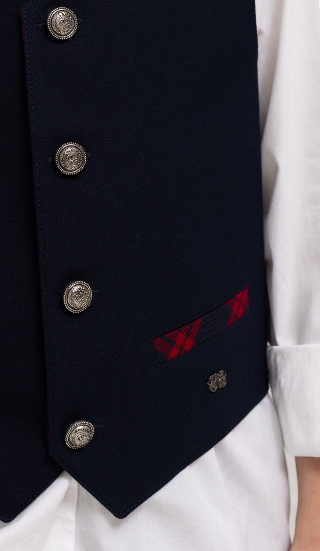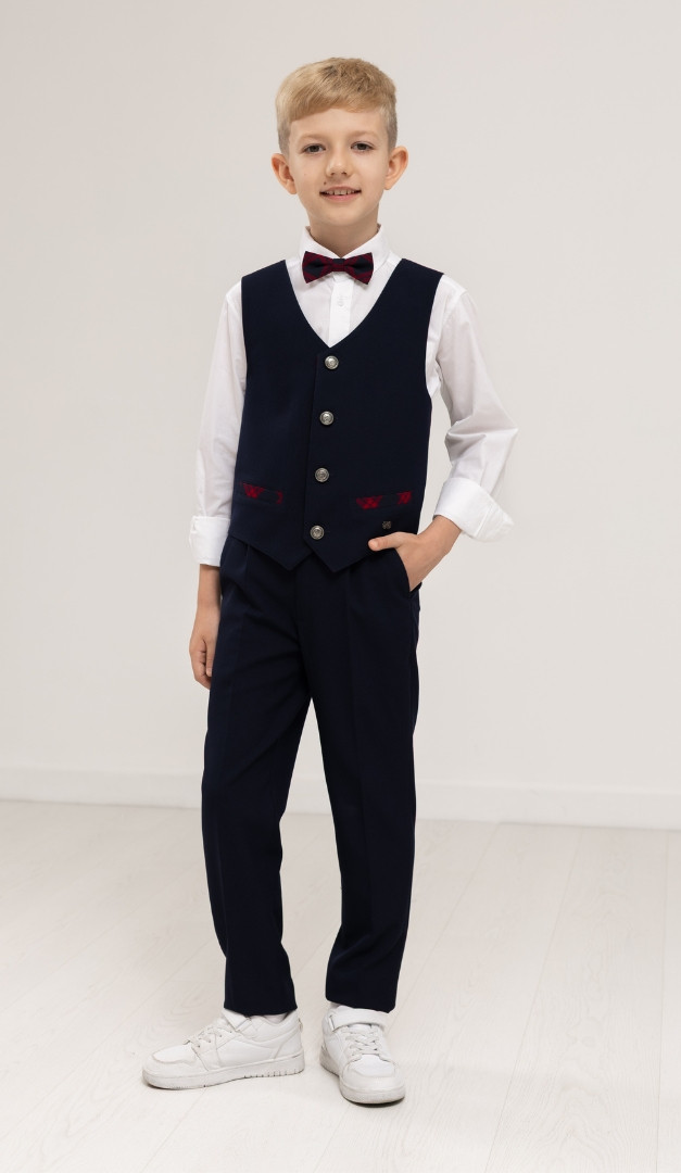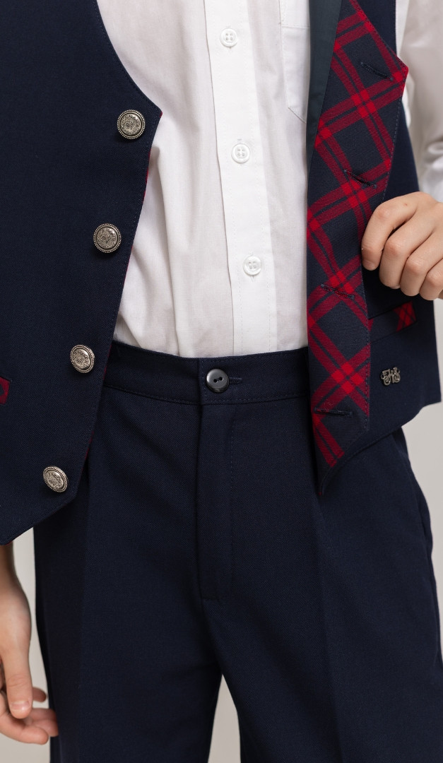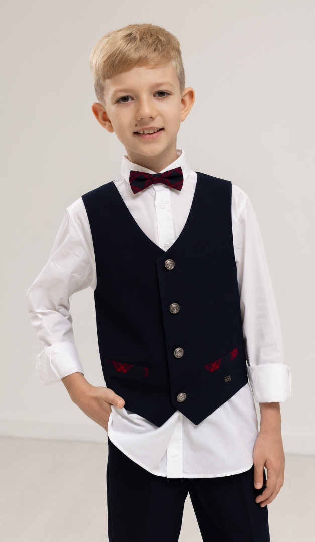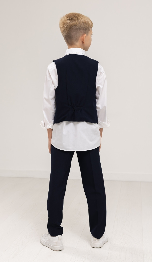 Классический и очень практичный жилет на подкладке для мальчика школьного возраста. Жилет прямого силуэта с центральной застежкой на пуговицы и декоративными карманами на полочке. Спинка с выточкой и с резинкой по линии талии.