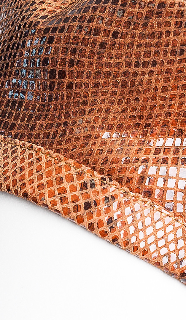 Оригінальний берет в незвичайний принт «рептилія» стане яскравим доповненням класичного пальто або куртки. Виріб по низу оформлено тонкою акуратною планкою. Модель прекрасно підійде для холодної пори року. Для максимального комфорту берет ззаду стягується на спеціальну резинку. Зсередини — на підкладці.