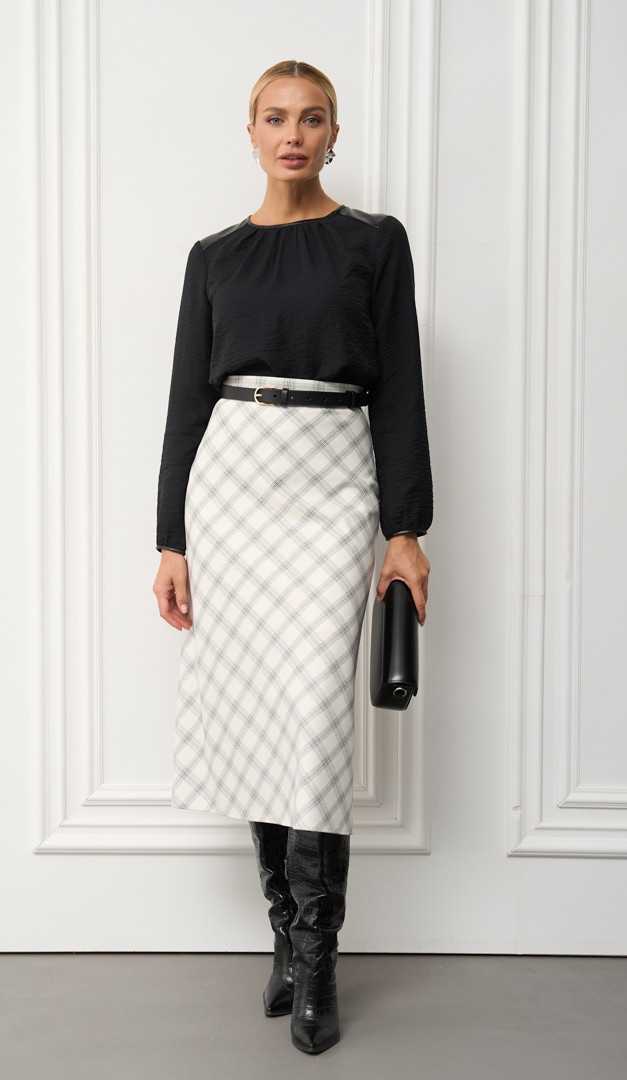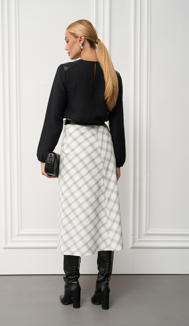На фото створений образ з спідницею трапеція молочною в клітинку (арт.2760).
