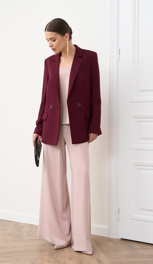 На фото створені образи з штанами палаццо пудровими (арт.4048) і жакетом кольору бордо (арт.2843).