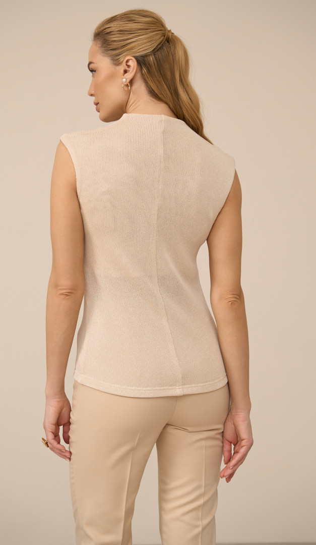 Топ жіночий трикотажний вершковий стане вдалим доповненням до будь-якого жіночого гардеробу. Модель прямого напіввільного крою, з невисоким коміром-стійкою та зручною проймою рукавів. Натуральний склад тканини, у якому 93% віскози, подарує відчуття цілковитого комфорту. Топ жіночий трикотажний вершковий завдяки своїй лаконічності та універсальному кольору буде ідеально поєднуватися як у ділових образах, так і в луках у стилі casual. Виріб зверху має двошарову текстуру.