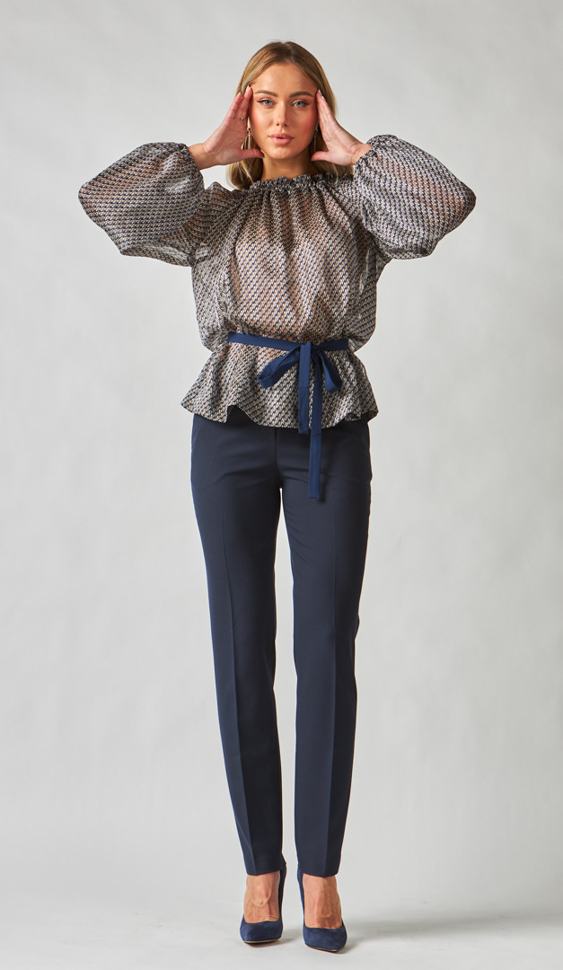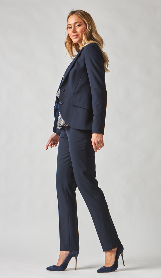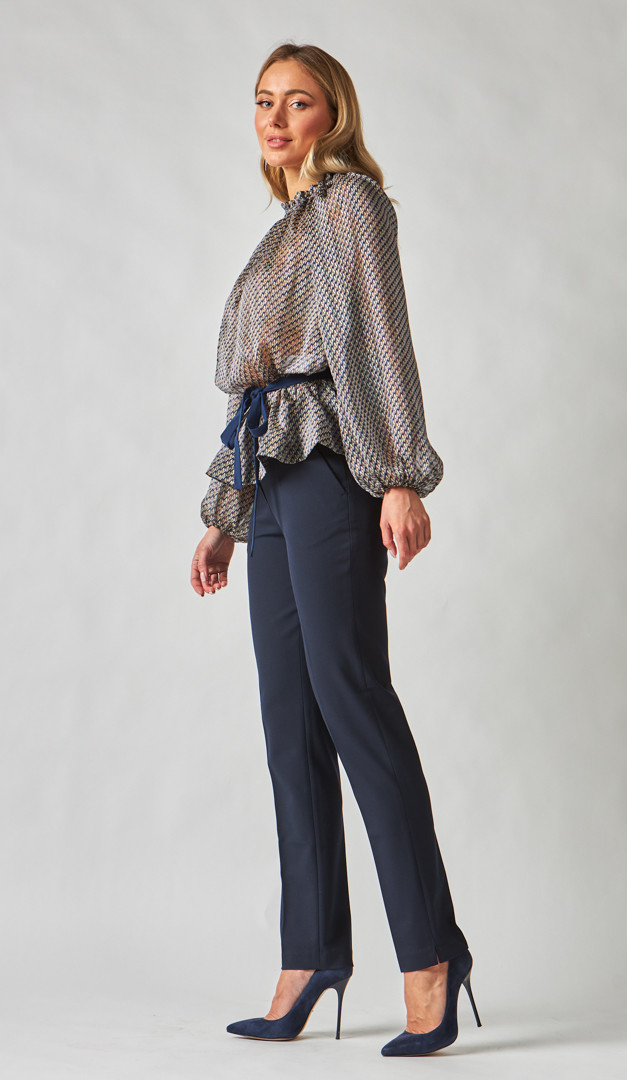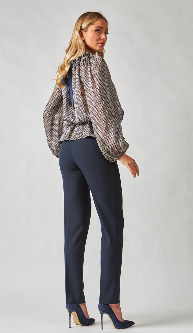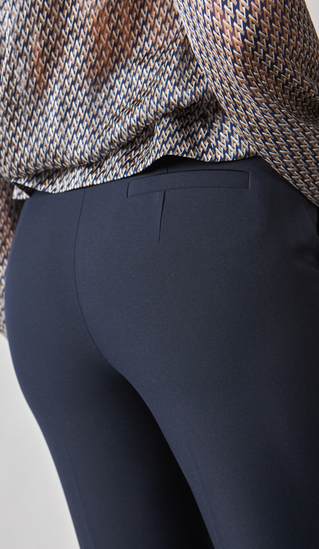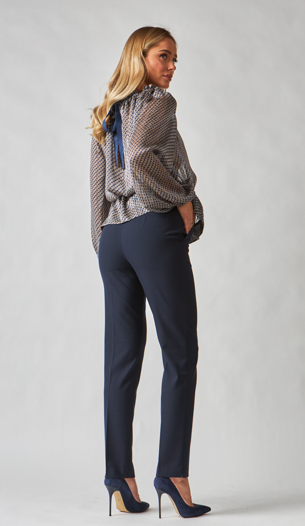 Немає нічого практичнішого і ефектнішого, ніж класичні штани! Штани базові сині мають напівприлеглий крій, який в доповненні з запрасованими стрілками, роблять жіночий силует неймовірно струнким, незалежно від розміру. Ця модель дуже зручна і практична, так як має середню посадку, а лінія талії добре фіксується і витончено підкреслюється за допомогою пояса з петлями для ременя. Стильні деталі штанів базових синіх - це функціональні бічні кишені та кокетливі розпірки в бічних швах по низу. Модель без підкладки.