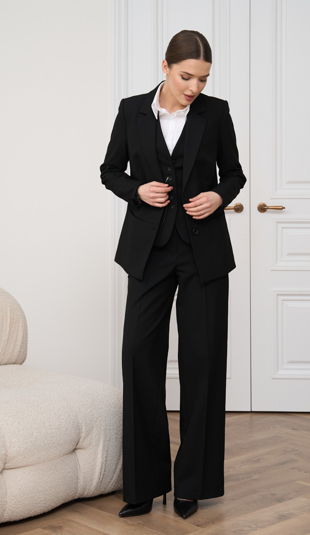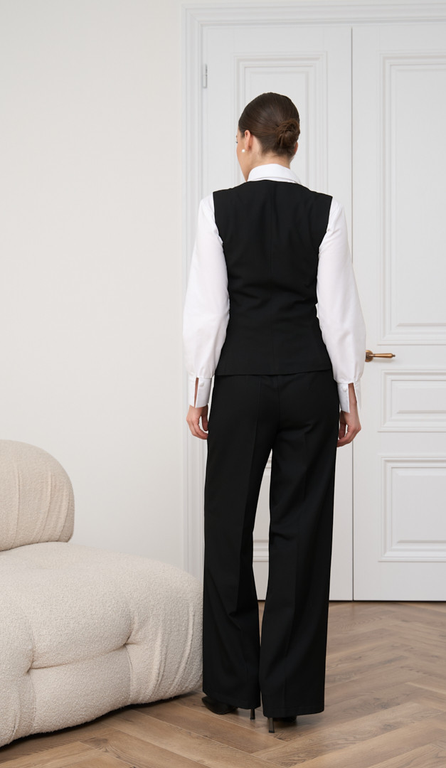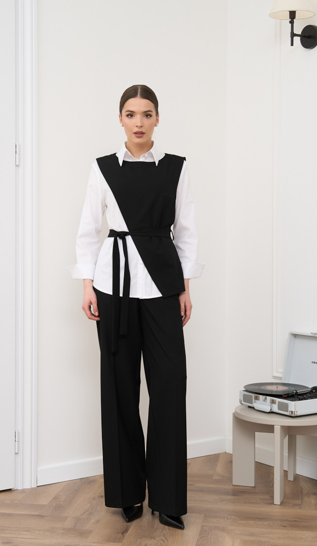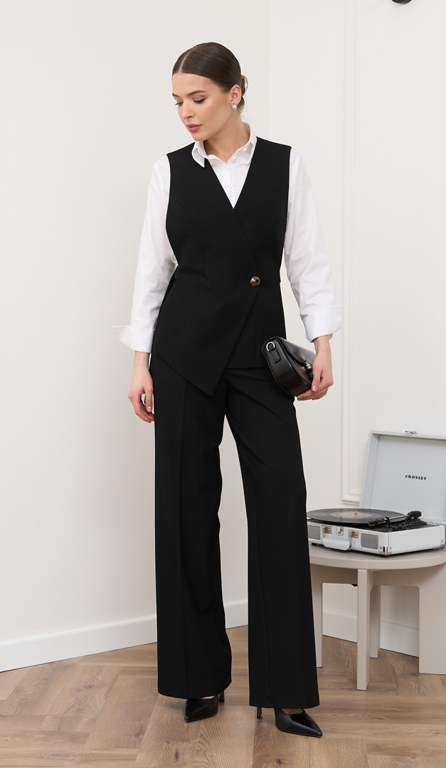На фото створений лук з блузкою базовою білою (арт.4007), жилетом з пасками чорним (арт.2841), жилетом асиметричним чорним (арт.4049) і жилетом класичним чорним (арт.2734).