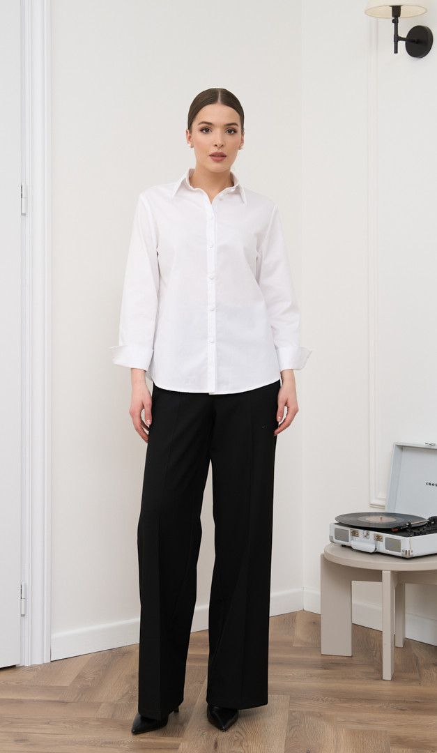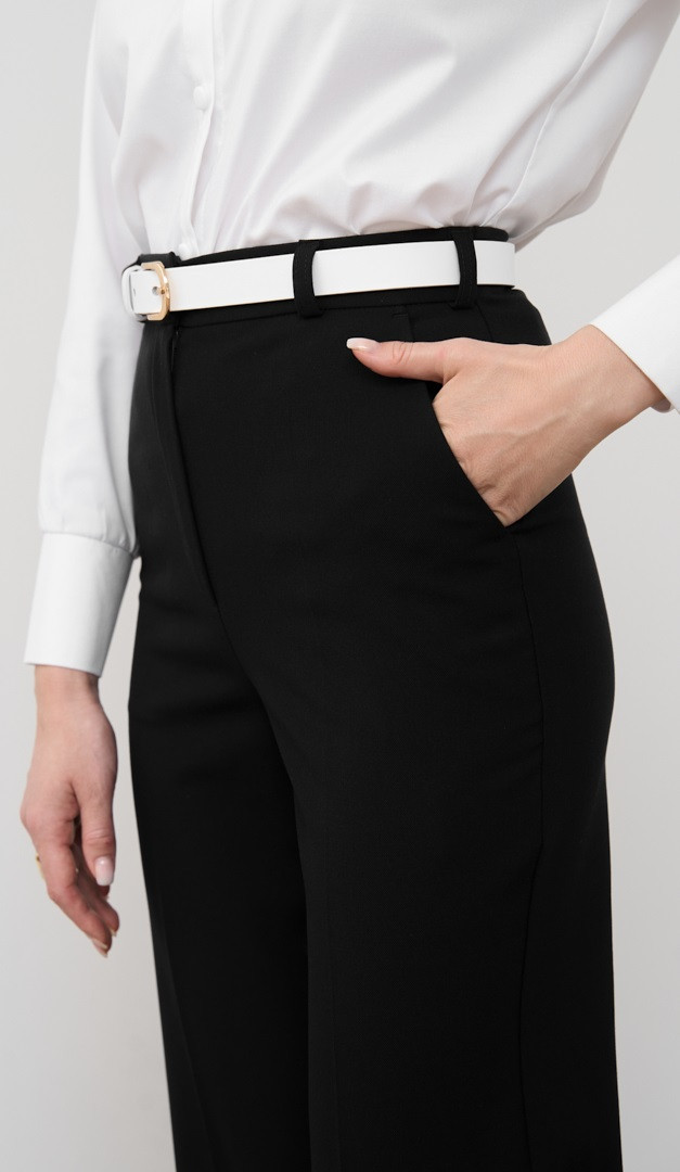 Штани прямі базові чорні стануть вдалим рішенням, для створення стильних жіночих образів. Модель має високу посадку по фігурі, прямий вільний крій і дві практичні кишені з боків. Штани прямі базові чорні застібаються на блискавку, один гаплик і ґудзик. Запрасовані стрілки підкреслюють стрункість силуету, а універсальний класичний колір вдало комбінується з будь-яким верхом. Пояс моделі ззаду доповнений невеликою еластичною резинкою. Без підкладки.
