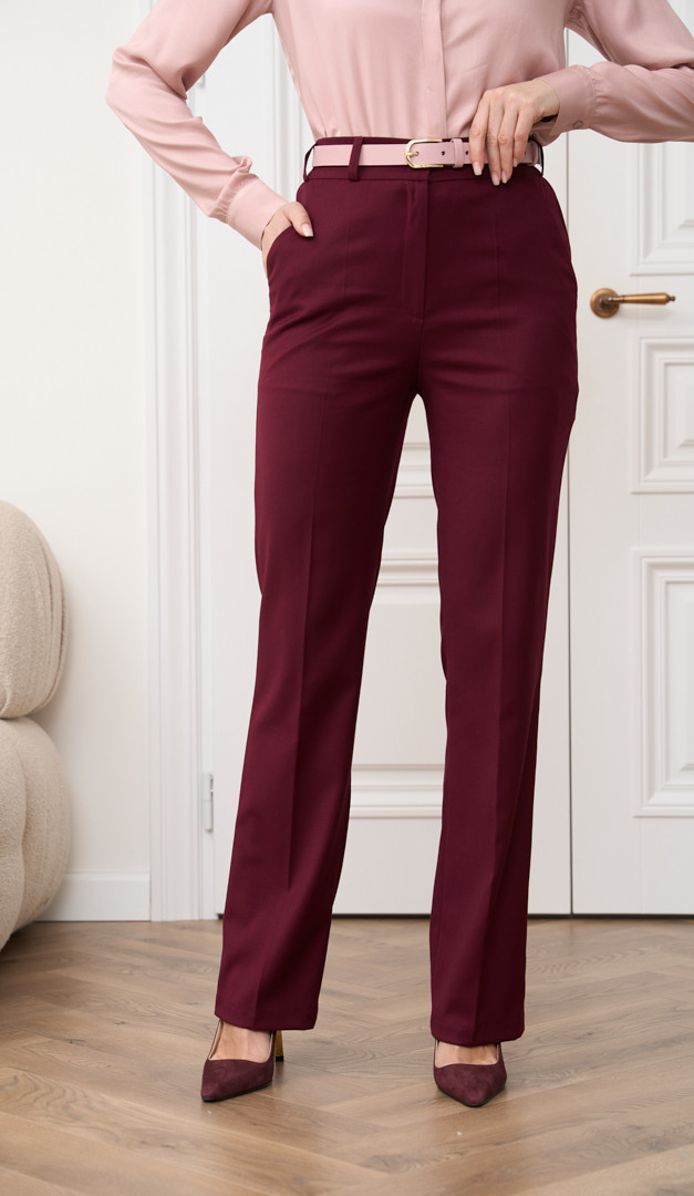 Штани жіночі кольору бордо — трендовий елемент гардеробу для створення стильних базових образів. Модель напіввільного прямого крою, зі зручною посадкою по фігурі та практичними прорізними кишенями. Штани жіночі кольору бордо застібаються на блискавку, один ґудзик і два гаплики. Запрасовані стрілки додають елегантності та підкреслюють стрункість жіночого силуету. Пояс виробу ззаду доповнений невеликими резинками з боків, що забезпечує ідеальну фіксацію і посадку по фігурі Штани жіночі кольору бордо – вдале рішення як для ділових, так і для щоденних аутфітів.