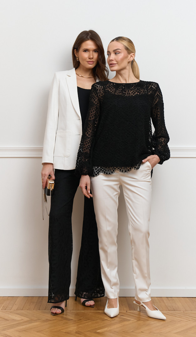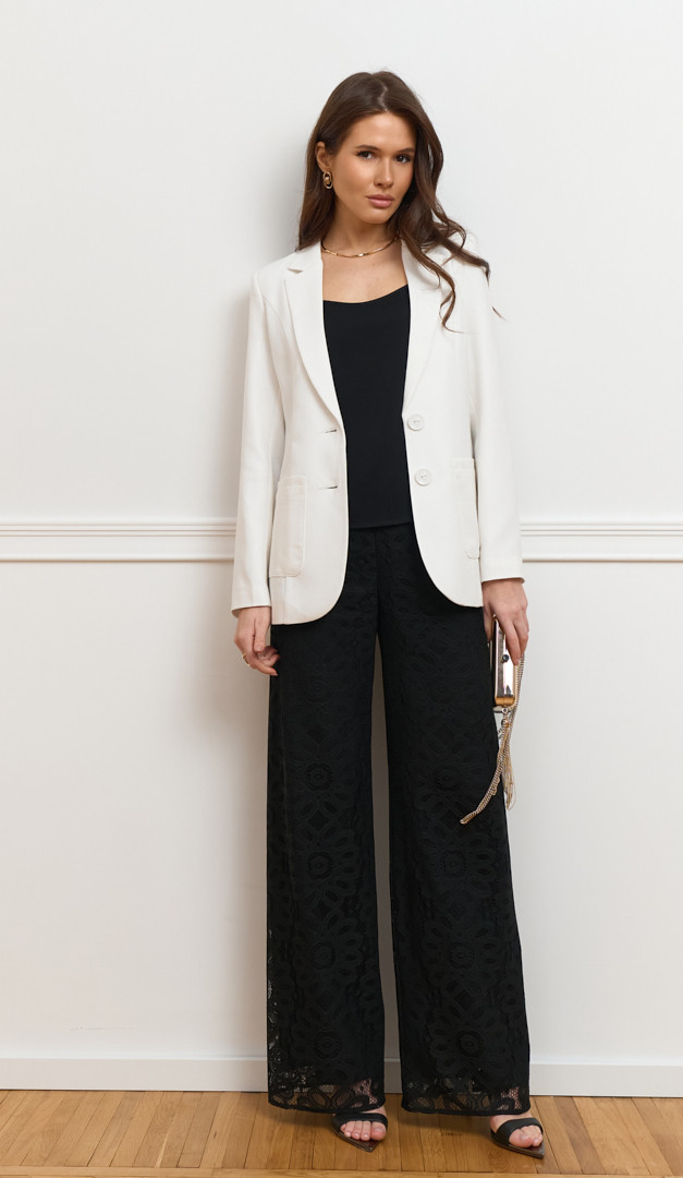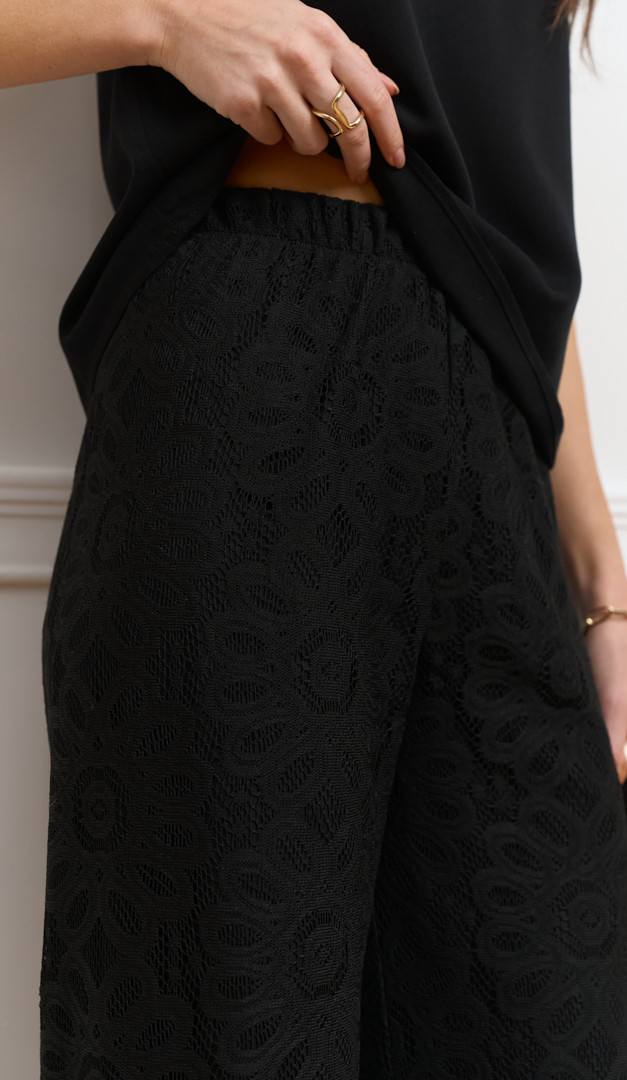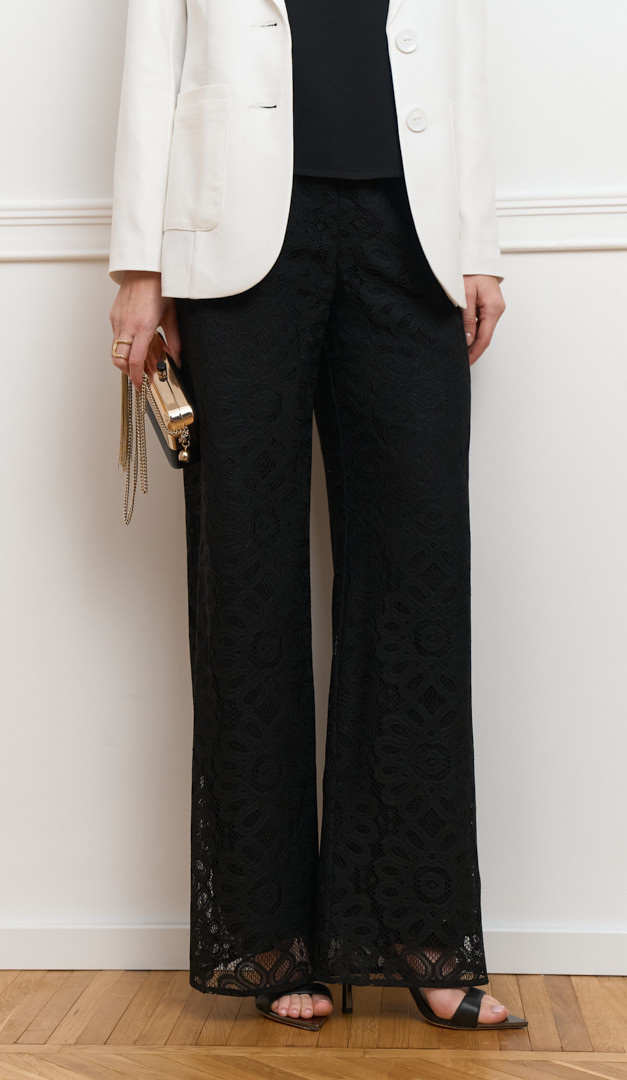 Штани жіночі з мережива чорні — трендовий вибір для літнього гардеробу. Модель прямого вільного крою, з завищеною лінією талії та широкою еластичною резинкою зверху. Штани жіночі з мережива чорні виконані із красивого прозорого мережива з візерунком та мають натуральну підкладку — віскоза 100%, по всій довжині. Така річ допоможе створити ефектні та жіночні образи для різних подій.
