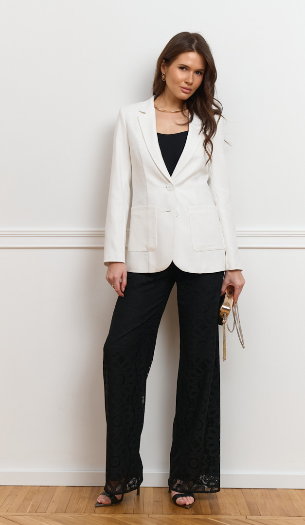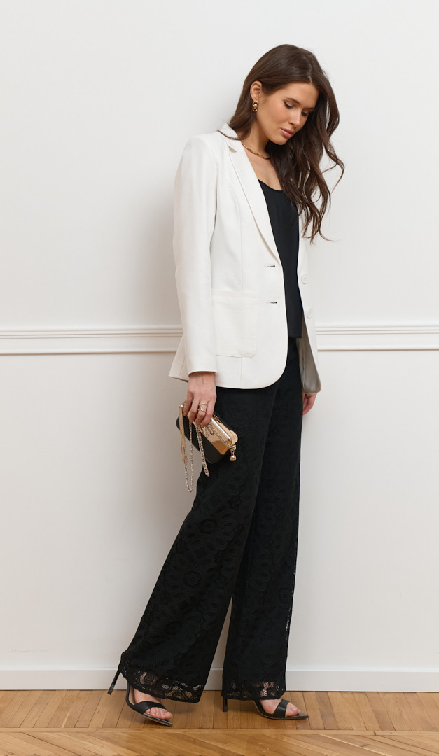 На фото створений лук з топом на тонких бретелях чорним (арт.2423) і жакетом льон молочним (арт.2917).