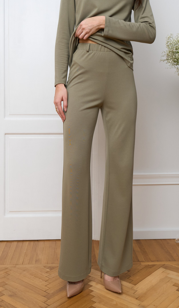 Штани жіночі прямі оливкові — універсальна річ для базового весняно-осіннього гардеробу! Модель вільного прямого крою з середньою посадкою по фігурі та практичною еластичною резинкою на поясі. Штани жіночі прямі оливкові виконані з трикотажу середньої щільності, що забезпечить комфорт та зручність. Завдяки мінімалістичному дизайну та лаконічному кольору, виріб буде вдало комбінуватися практично з будь-яким верхом. Без кишень та підкладки.