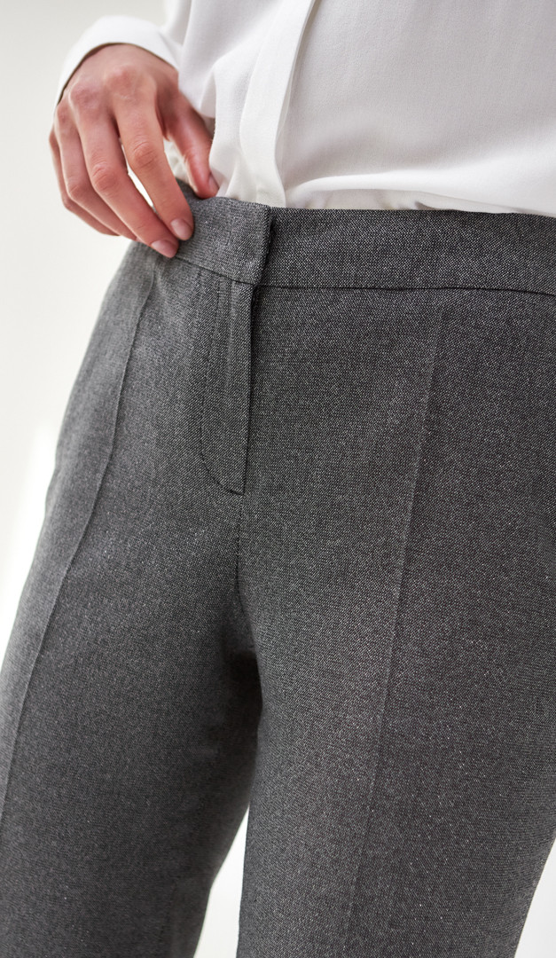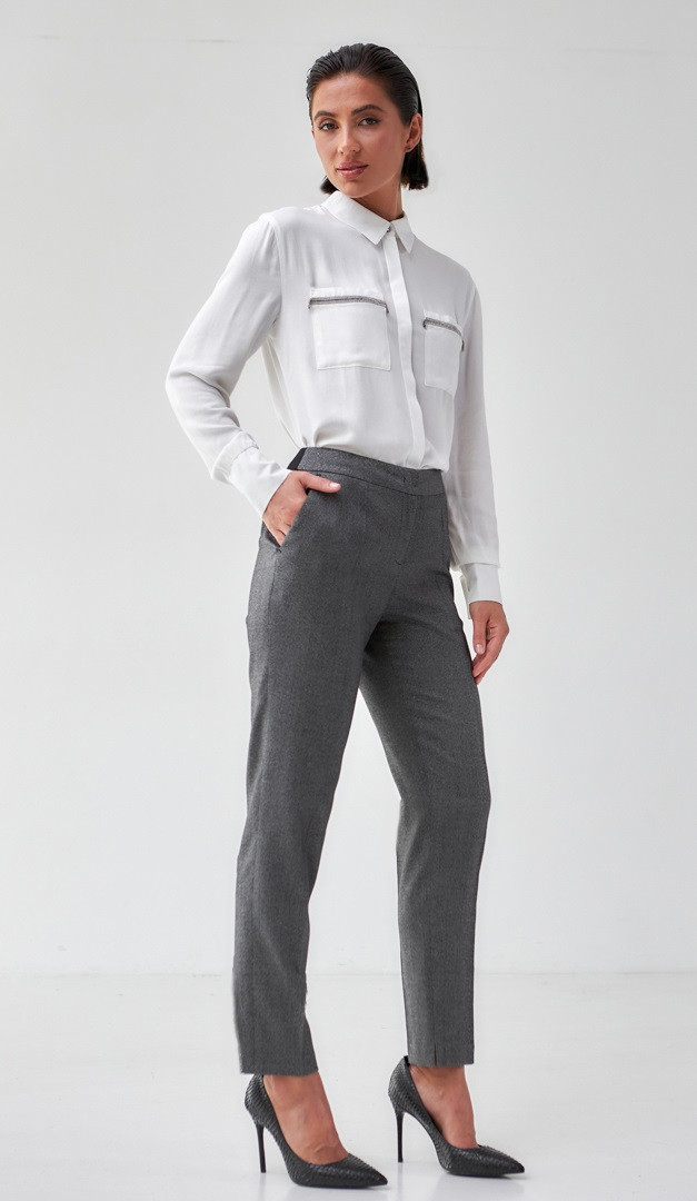 Оригінальні класичні штани жіночі чорно-сірий меланж, які зроблять будь-який діловий і офісний образ більш ефектним! Модель виконана з тканини середньої щільності з тонкою люрексною ниткою. Штани жіночі чорно-сірий меланж мають злегка звужений до низу, напіввільний крій, верх оформлений нешироким поясом із застібкою на «блискавку», один ґудзик і гаплик, а також практичними функціональними кишенями. Висота посадки — середня. Штани жіночі чорно-сірий меланж доповнені акуратними запрасованими стрілками і невеликими розпірками по внутрішньому шву для зручності.