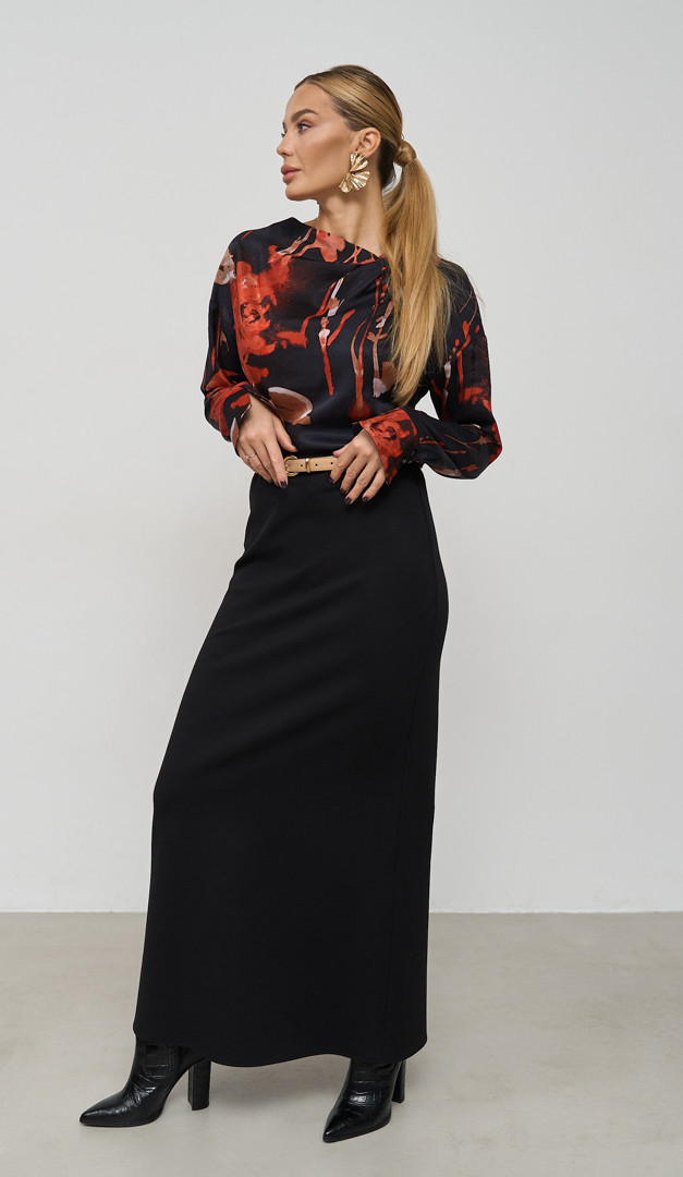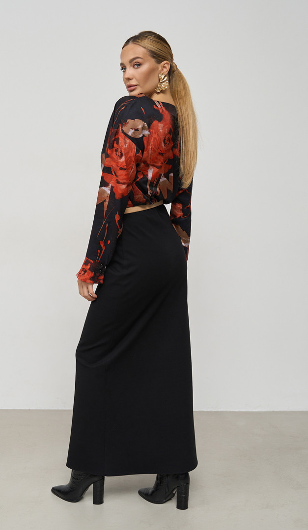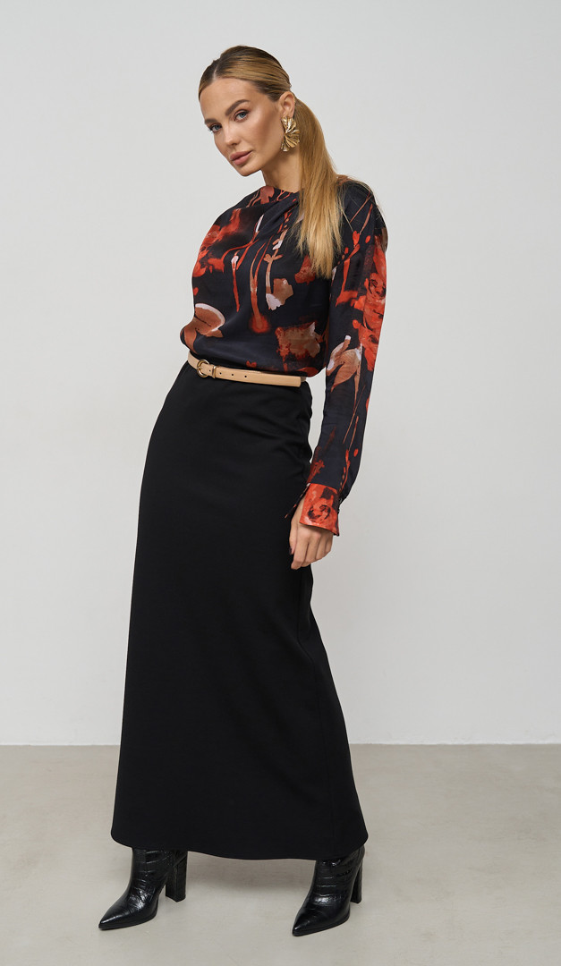 На фото створений образ з блузкою принт троянда (арт.2448).