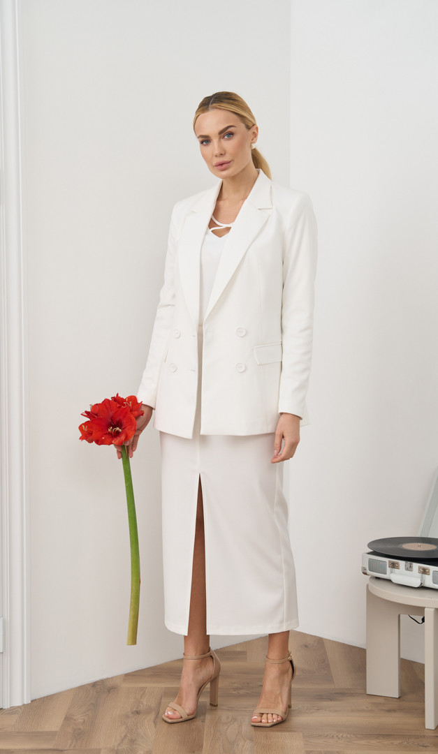 На фото створений образ з топом з переплетенням молочним (арт.1819) і жакетом молочним (арт1837).