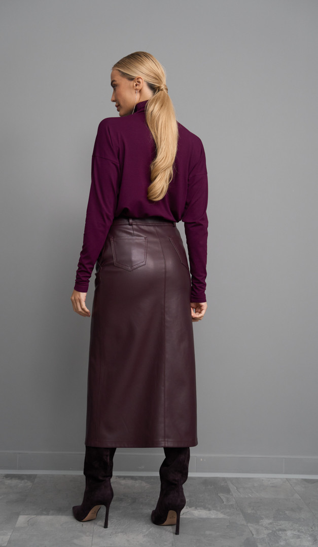 Спідниця пряма з екошкіри бордо — базова та неймовірно трендова річ у цьому сезоні! Модель прямого крою з середньою посадкою по фігурі та елегантною довжиною міді. Спідниця пряма з екошкіри бордо має зручну застібку на один ґудзик і блискавку по центру переду. Широкий пояс виробу виконаний з петлями для ременя, що допоможе підкреслити витонченість жіночого силуету та доповнить образ стильним акцентом. Практичності спідниці додають місткі прорізні кишені та висока шліца, які розташовані спереду та функціональні накладні кишені — ззаду. Спідниця на підкладці.