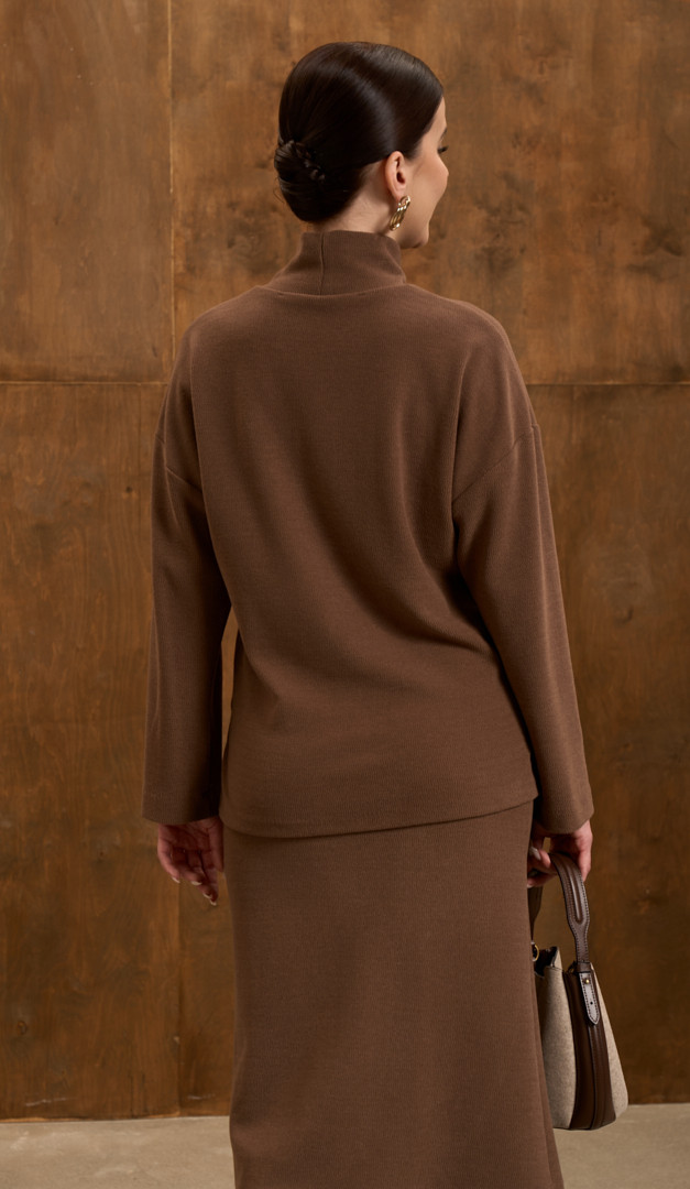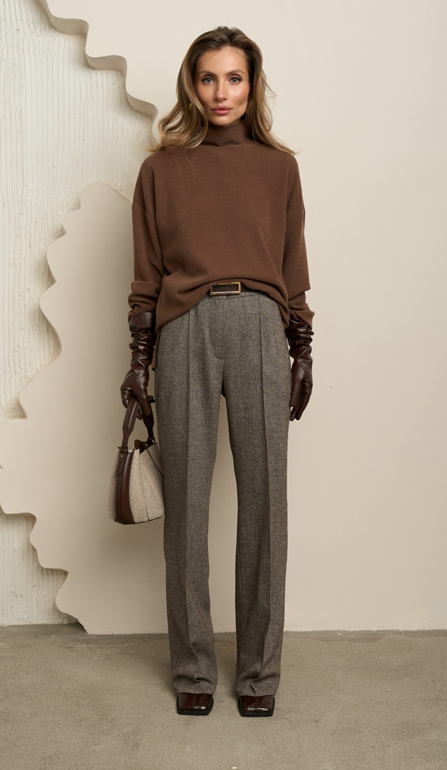 На фото створений лук із спідницею трикотажною кавовою (арт.4020) та штанами з вовни (арт.2806).
