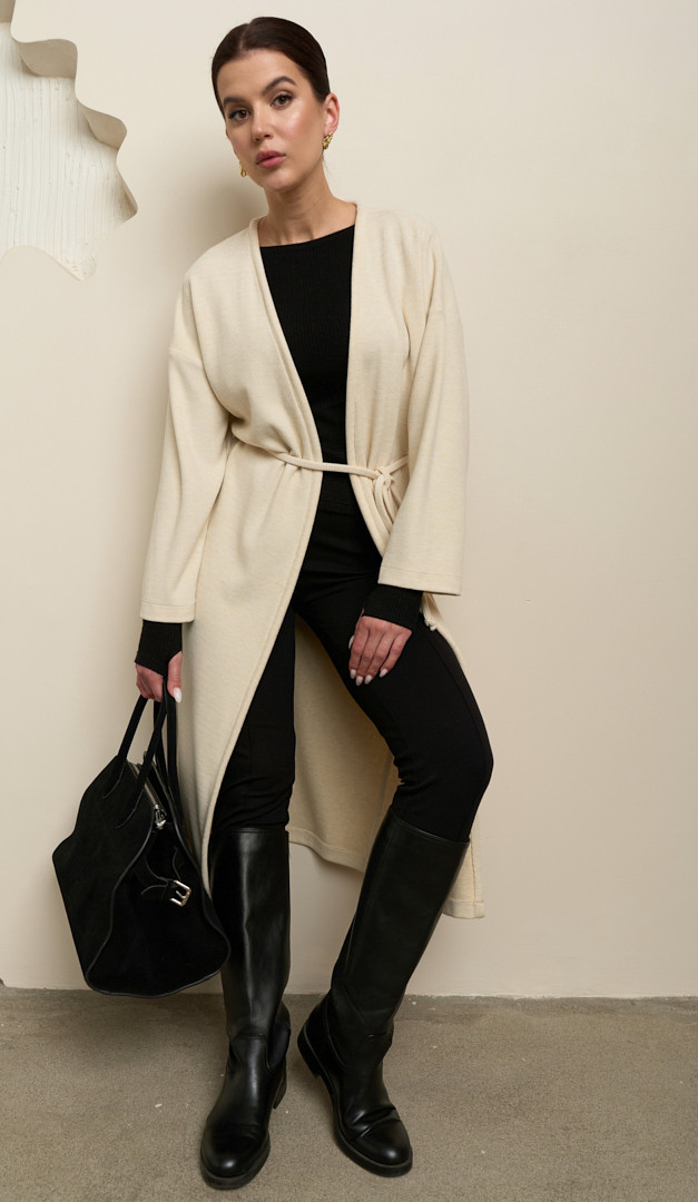 Кардиган жіночий трикотажний молочний додасть образу стилю та затишку. Модель виконана з щільного, приємного на дотик трикотажу, що гарно тримає форму і має оригінальний хвилястий рельєф. Кардиган жіночий трикотажний молочний доповнений тонким поясом, завдяки якому виріб можна зафіксувати на лінії талії. Модель має подовжену лінію плеча та довгий вільний рукав, а жіночна довжина міді додає їй елегантності. Без застібок.