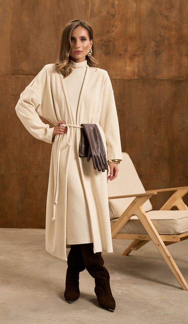 На фото створений образ з сукнею молочною (арт.4022) та топом базовим чорним (арт.2818) і брюками завуженими теплими чорними (арт.1995).