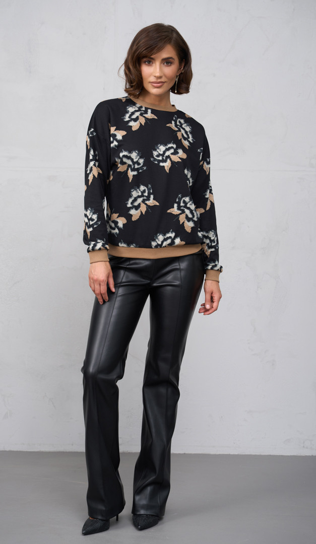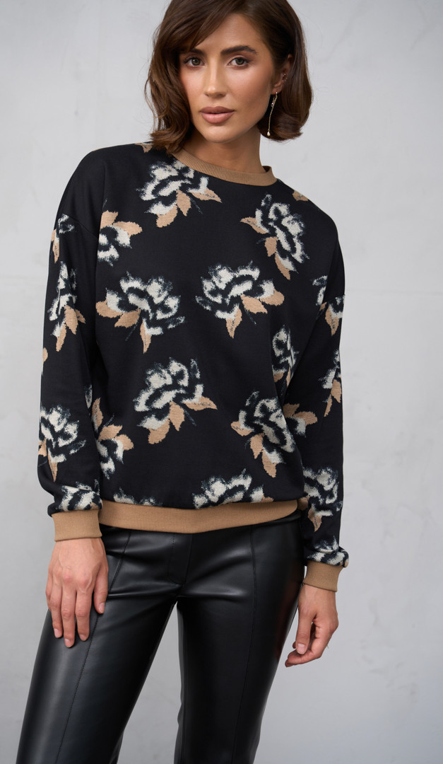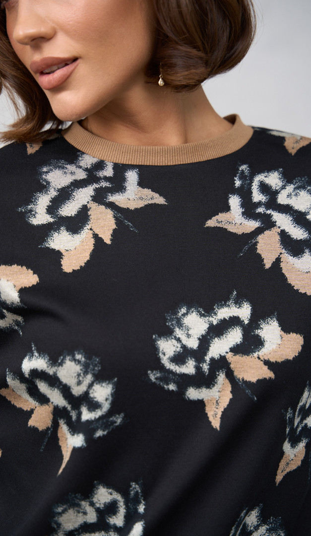 Світшот з принтом чорний — трендовий і практичний елемент в жіночому гардеробі. Модель вільного прямого крою, з неглибоким округлим вирізом горловини і довгим рукавом з приспущеною лінією плеча. Світшот з принтом чорний має красивий контрастний принт “квіти”, що підкреслює його жіночність та оригінальність. Дизайн еластичних манжетів рукавів та низу моделі повторюється і на горловині, що безумовно, додає їй особливого стилю та виразності.