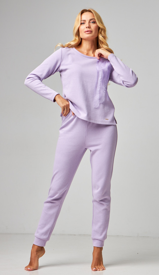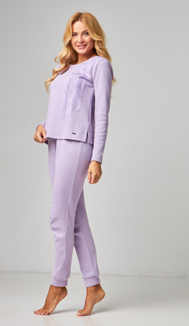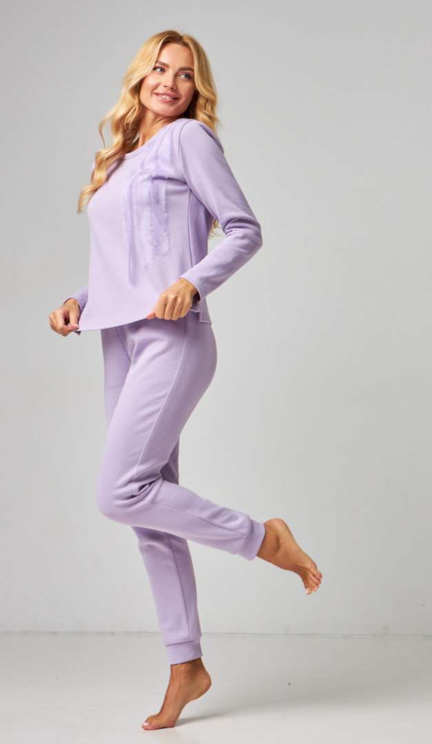 Затишний та стильний костюм домашній жіночий бузковий із приємної до тіла тканини. Модель складається з комплекту – кофта і штани. Кофта вільного прямого крою, з неглибоким округлим вирізом горловини, довгим рукавом і невисокими розпірками по бокових швах знизу. Штани злегка звуженого до низу фасону, мають м'яку зручну резинку на поясі та широкі манжети по низу. Родзинка костюму домашнього жіночого бузкового — миловидне декорування передньої полички.