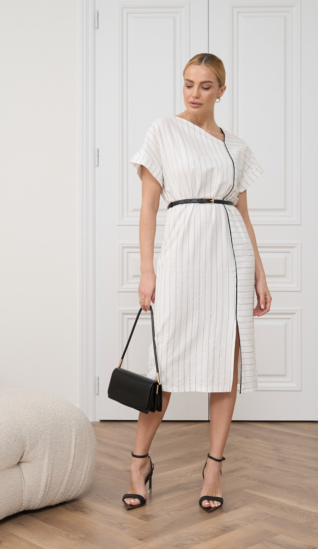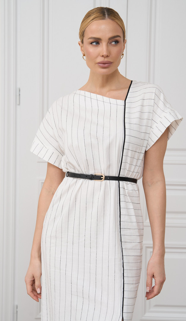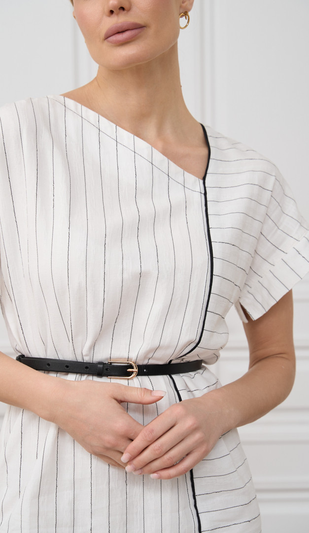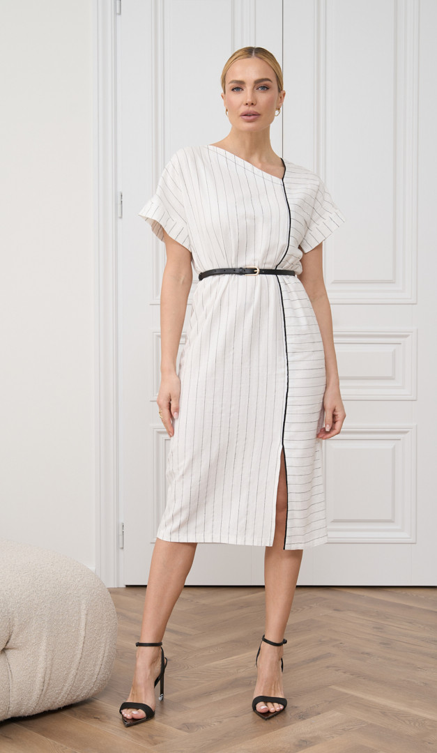 Сукня з бавовни в смужку, виконана в невимушеному круїзному стилі, подарує вам водночас і комфорт, і жіночність! Модель має прямий вільний крій в поєднанні з елегантною довжиною міді. Горловина сукні з бавовни в смужку оформлена оригінальним асиметричним вирізом. Вільний цільно кроєний рукав з невеликим відворотом прикриває лінію плеча, а контрастна тонка планка, що переходить в кокетливу розпірку, візуально додає силуету стрункості. Без застібок і підкладки.