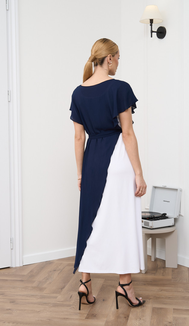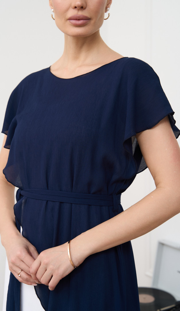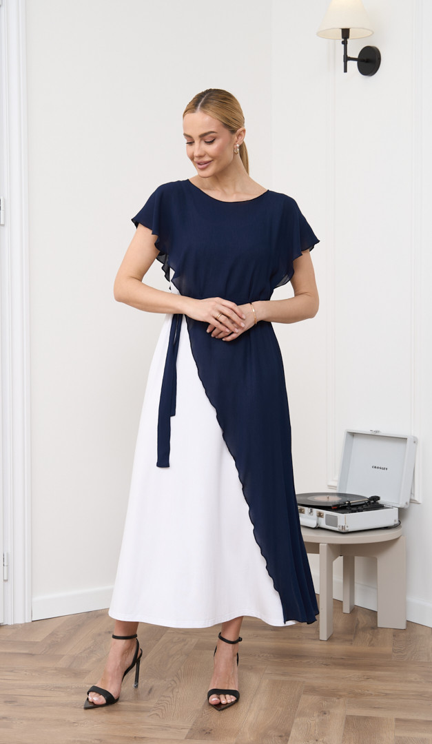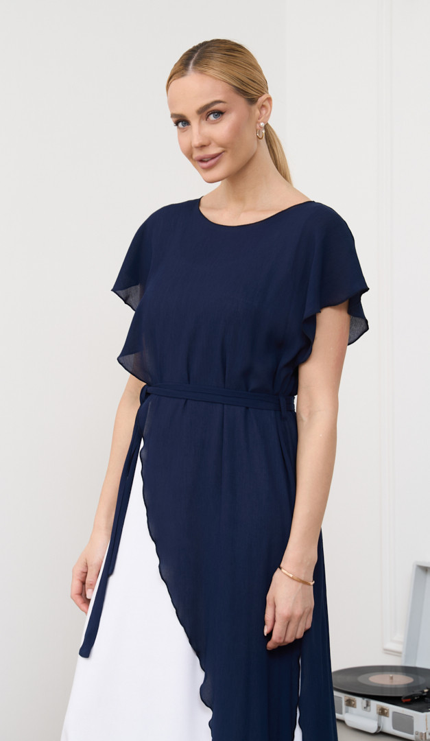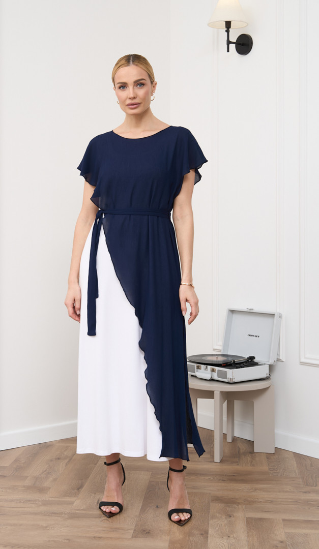Сукня літня комбінована синьо-біла додасть ефектності та підкреслить жіночність. Модель виконана із двох самостійних виробів: білої сукні з натуральної тканини – віскоза 100% та асиметричної темно-синьої накидки. Сукня прямого напіввільного крою, з широкими бретельками та округлим вирізом горловини. Накидка має вільний асиметричний крій, неглибокий округлий виріз горловини та на лінії талії доповнена функціональним поясом. Контраст кольорів і комбінація різних фактур тканини створюють неймовірно стильний образ.
