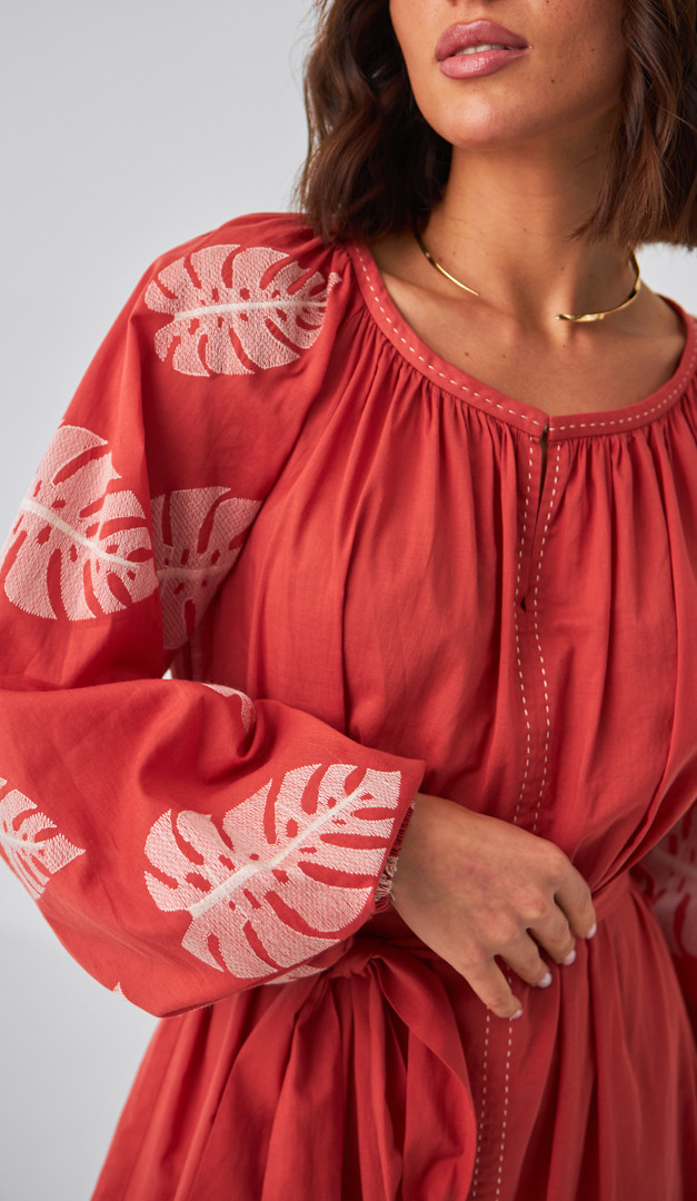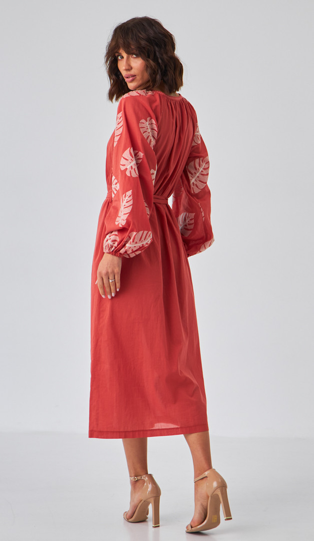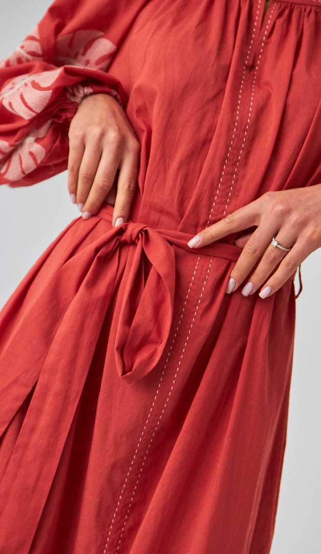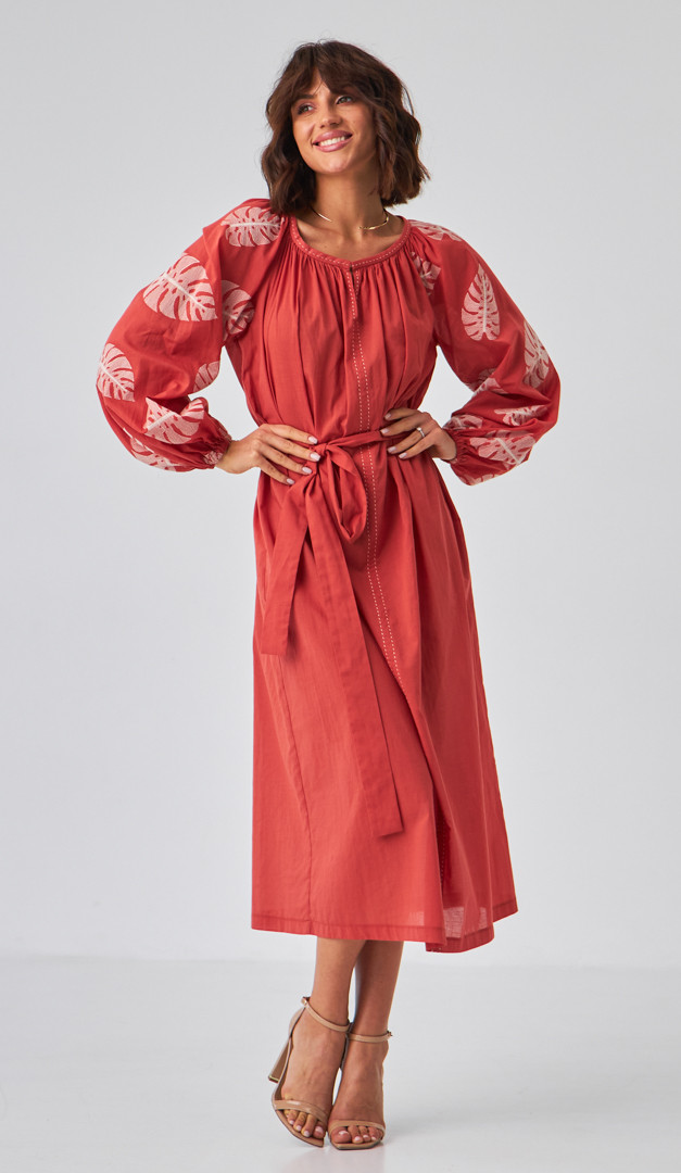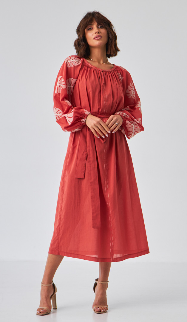 Для легких яскравих образів ідеальним рішенням стане сукня літня теракотова з орнаментом. Модель має прямий вільний крій, неглибокий округлий виріз горловини та довгий практичний рукав, що по низу оформлений еластичною резинкою. Сукня літня теракотова з орнаментом виконана із 100 % віскозної тканини, яка подарує комфорт навіть у самий спекотний день. Родзинка моделі — красива флористична вишивка на рукавах і контрастна лінія по центру переду. Сукня літня теракотова з орнаментом має застібку на один гаплик спереду, а лінія талії підкреслюється поясом із аналогічної тканини. В комплекті додається нижня спідниця, виготовлена із натуральної тканини 100% віскоза.