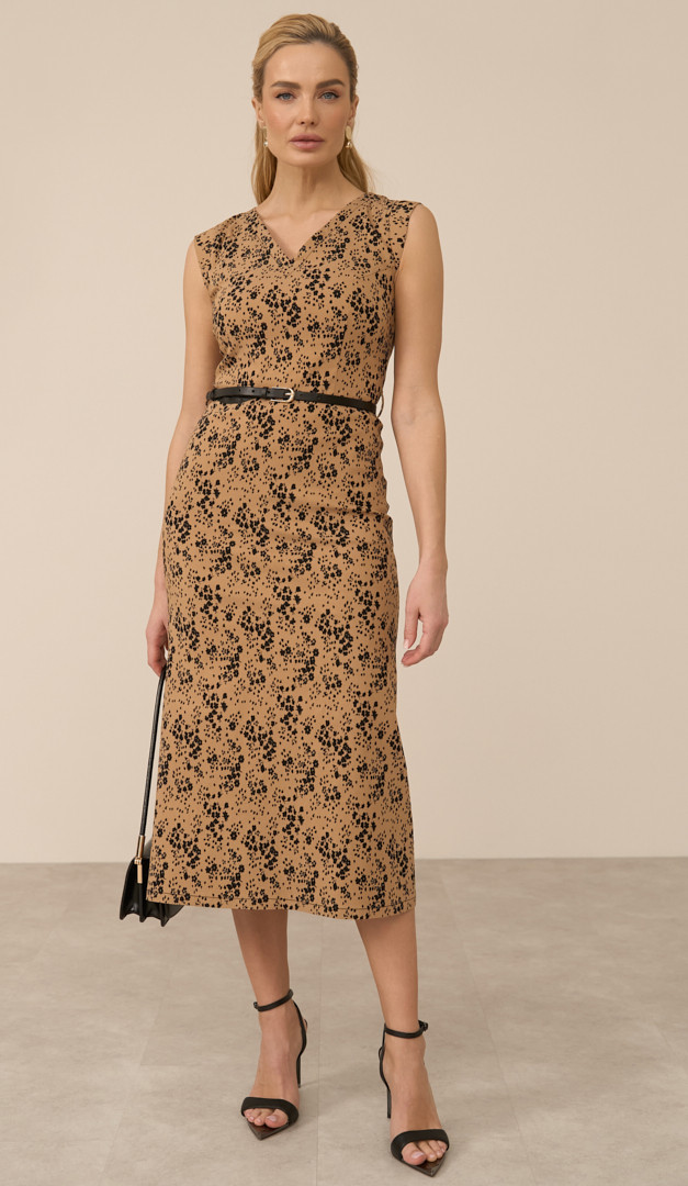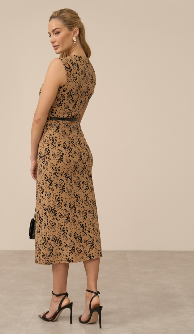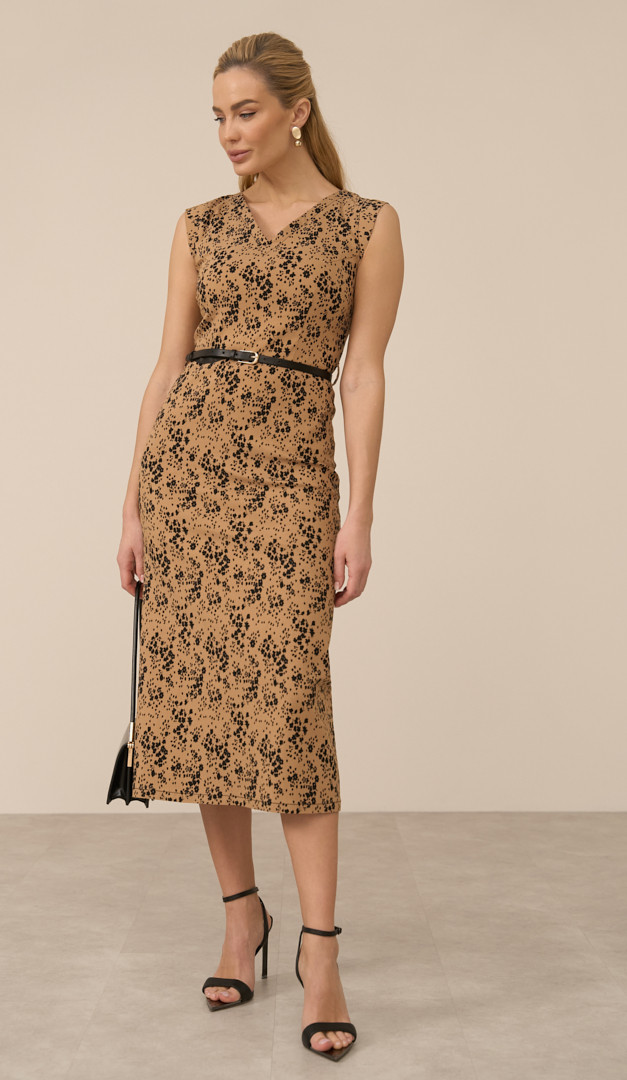Сукня міді в квітковий принт карамельна додасть впевненості та підкреслить вашу жіночність — це універсальне рішення як для класичного ділового образу, так і для особливих подій. Сукня міді в квітковий принт карамельна має неглибокий V-подібний виріз горловини, відрізну лінію талії та злегка розширений до низу крій. Елегантності виробу додає трендова довжина міді, а контрастний квітковий принт підкреслює виразність створеного образу. Модель має практичну застібку-блискавку, яка розташована в задньому центральному шві та петлі для ременя в області талії. Без підкладки.