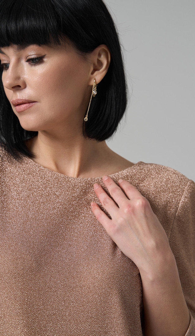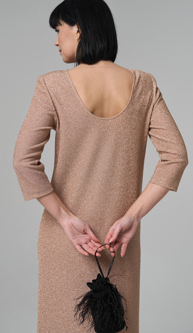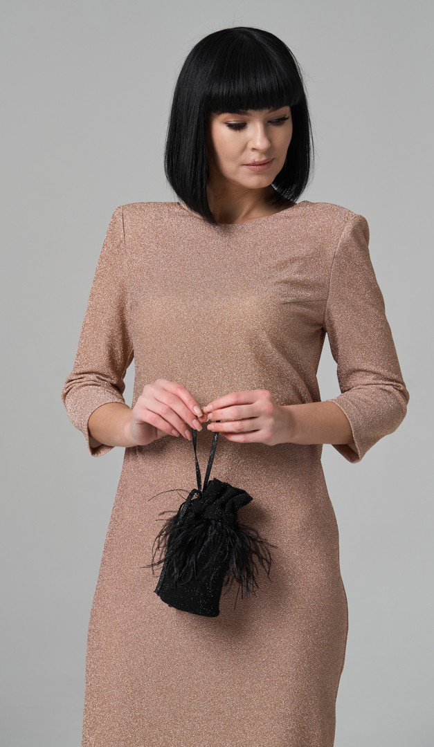 Для особливих подій на яких хочеться виглядати ефектно та яскраво вдалим вибором стане сукня міді золотиста. Модель прямого напіввільного крою, з класичним округлим вирізом горловини, який ззаду переходить у неглибокий U-подібний виріз. Сукня міді золотиста має зручний вкорочений рукав і трендову довжину, яка підкреслює елегантність створеного образу. Виріб доповнений тонкими плечовими накладками. Без застібок та підкладки.