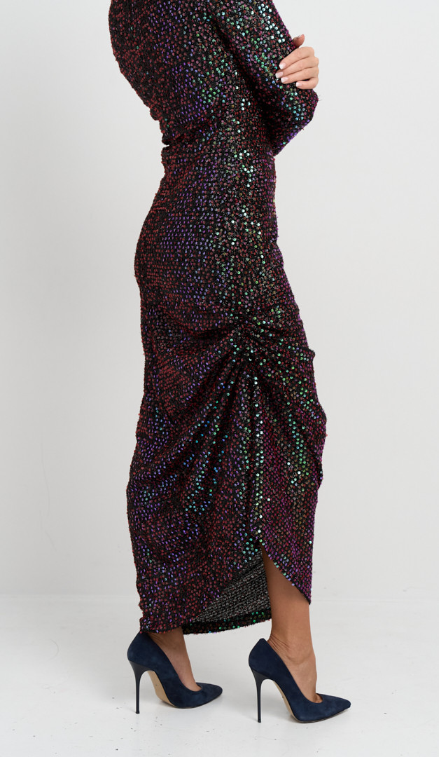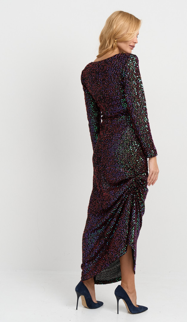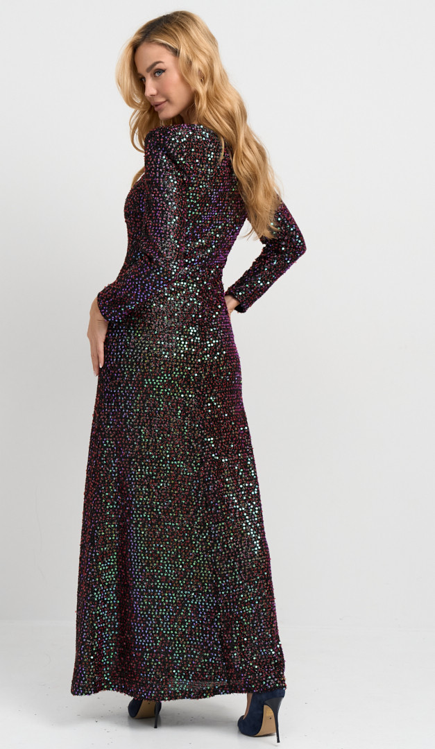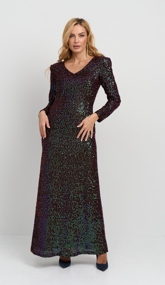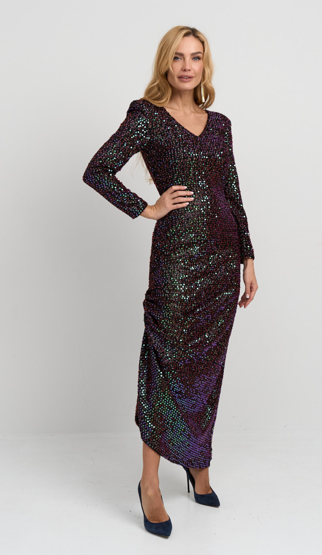 Для створення яскравого жіночного образу обирайте сукню святкову з паєтками. Модель з облягаючим верхом та злегка розкльошеним до низу кроєм, V-подібним вирізом горловини і довгим рукавом. Сукня святкова з паєтками має елегантну довжину максі, що підкреслює витонченість та елегантність силуету. Особлива деталь – функціональна затяжка, яка розташована в шві одного з боків, та додає образу граційності й практичності. Виріб з підкладкою.