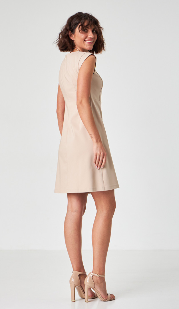Сукня трапеція карамельна – стильне рішення як для щоденного виходу, так і для особливих подій. Модель напівприлеглого укороченого крою із завищеною лінією талії. V-подібний виріз горловини оригінально прикрашений стильними паєтками, а також доповнений акуратною сіточкою. Сукня трапеція карамельна виконана з імітацією трендового ефекту на «запАх» і має акуратний короткий рукав-”крильце”. Застібається виріб на «блискавку» в середньому шві задньої частини. Без підкладки.