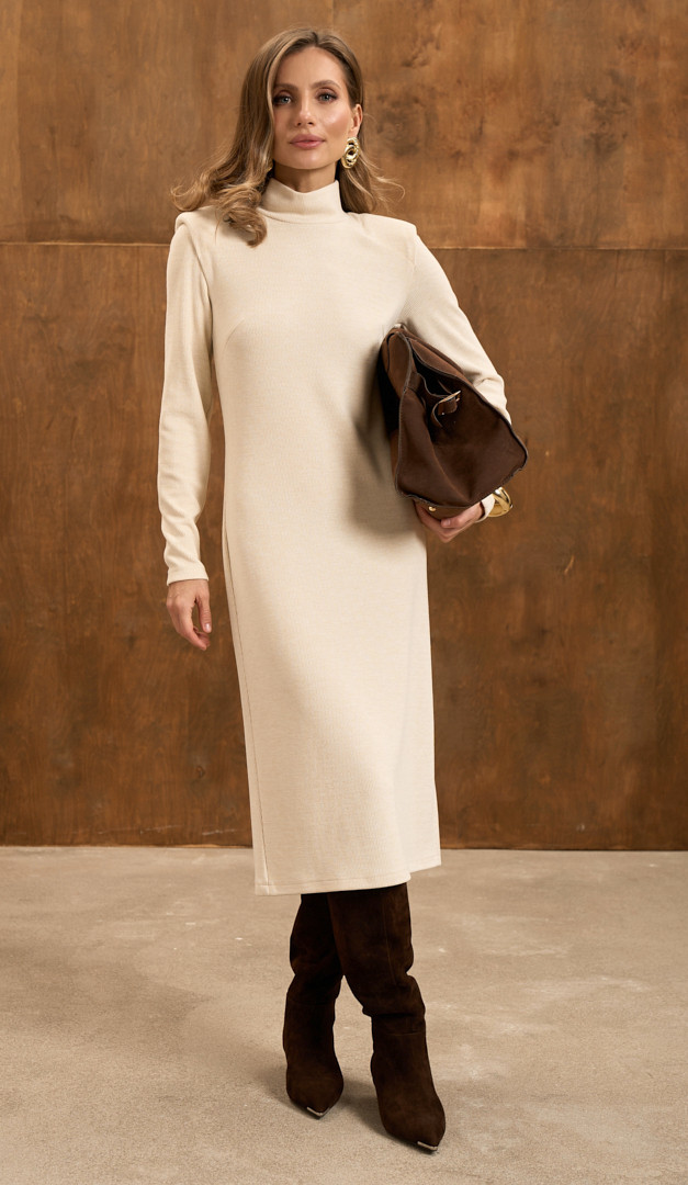 Cилуетна сукня трикотажна міді молочна — ідеальний варіант для створення елегантного та жіночного образу. Модель виконана із рельєфного м’якого трикотажу середньої щільності. Сукня трикотажна міді молочна має облягаючий крій, довгий рукав і зручний комір-стійку. Акцентна деталь виробу — оригінальні плечові накладки, що стильно підкреслюють лінію плечей. Трендова довжина міді та високий розріз в центральному задньому шві додають сукні граційності та зручності. Без підкладки і застібок.