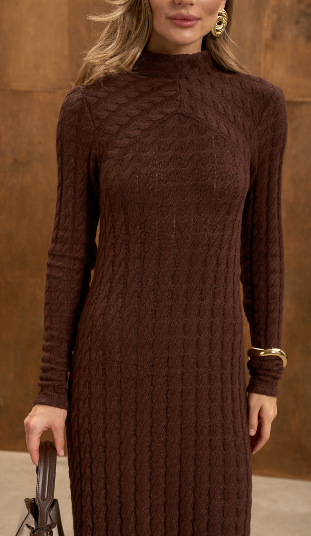 Сукня трикотажна з косами шоколадна — універсальний must have для жіночого гардеробу в прохолодний сезон. Модель виконана із еластичного, середньої щільності трикотажу з характерним візерунком «коси». Сукня трикотажна з косами шоколадна має ефектно прилеглий верх, невисокий цільно кроєний комір-стійку та довгий рукав. Верх виробу оформлений оригінальним фігурним вирізом. Злегка розкльошений низ, елегантна довжина максі та трендовий насичений колір підкреслюють жіночність створеного образу та додають ефектності.