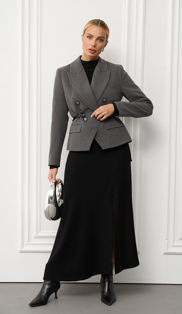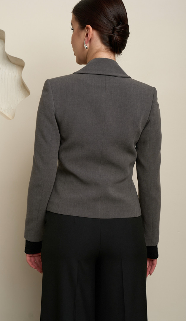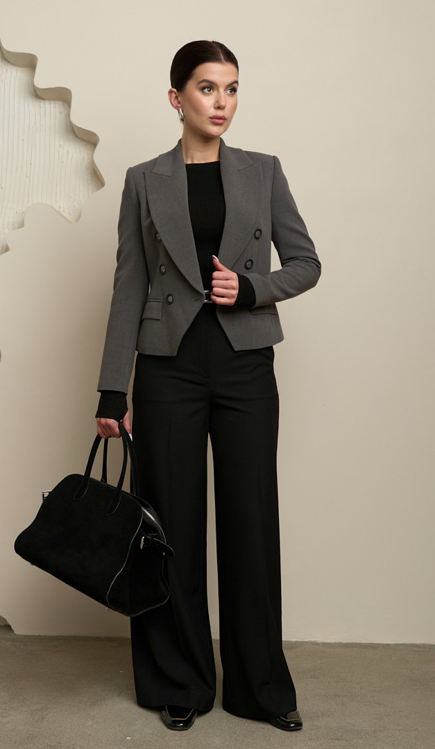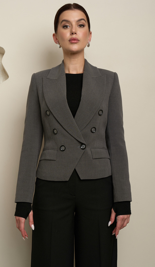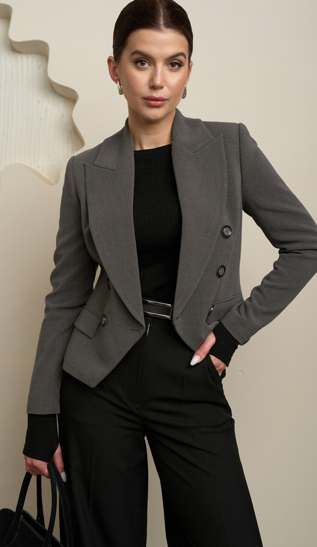 Жакет двобортний сірий — базова річ для класичного жіночого гардеробу. Модель трендового напівприлеглого крою з V-подібним вирізом, що оформлений оригінальним відкладним коміром з фігурними бортами. Жакет двобортний сірий застібається на один внутрішній та один зовнішній ґудзики. Рукав — довгий, злегка звужений до низу. Перед жакета двобортного сірого доповнений функціональними кишенями з клапанами. Зсередини виріб на підкладці.