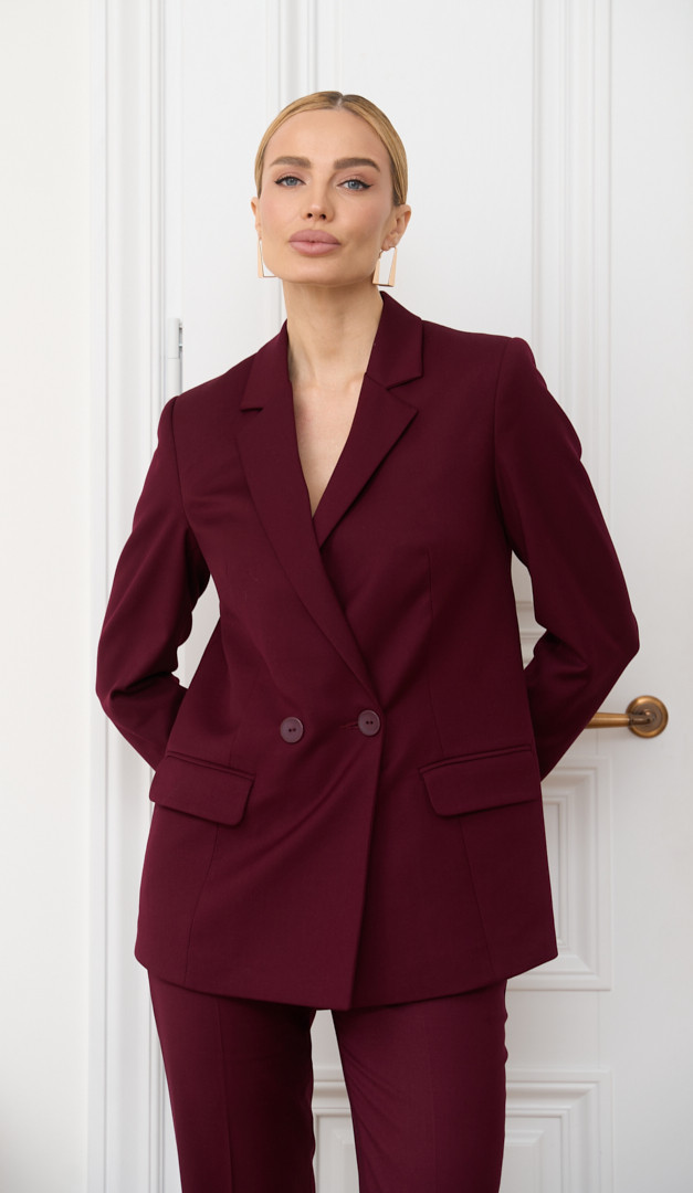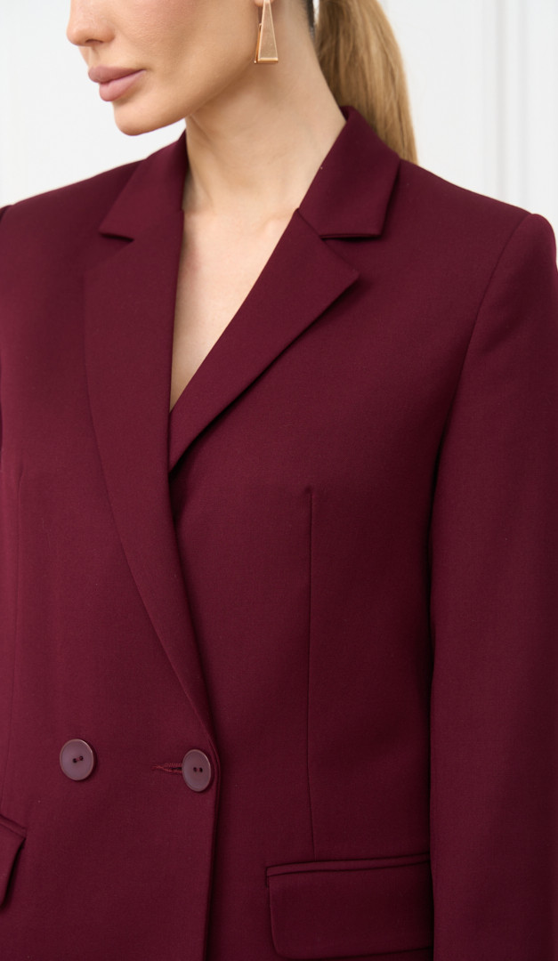 Коли є бажання додати до свого повсякденного ділового образу ефектності та яскравого настрою — обирайте жіночий кольору бордо. Виріб має прямий напіввільний крій, елегантний V-подібний виріз горловини з класичним відкладним коміром і стильну застібку на два ґудзики. Перед жакету жіночого кольору бордо доповнений стильною імітацією кишень “в рамці”. З середини модель виконана з підкладкою. Такий жакет, безперечно, стане справжньою родзинкою у Вашому базовому гардеробі.