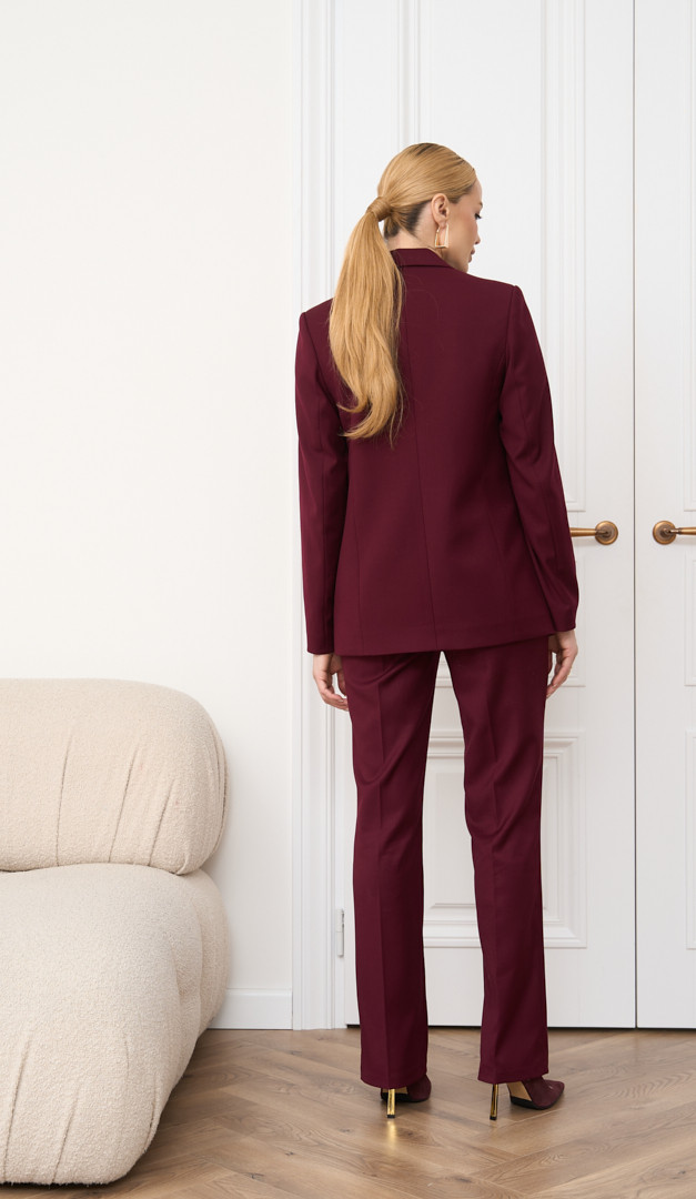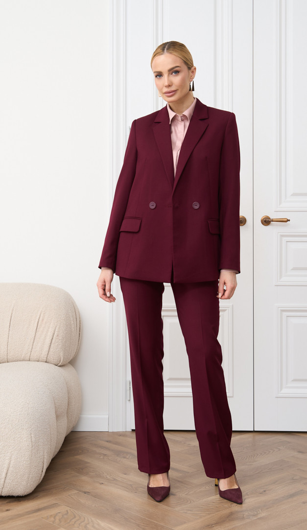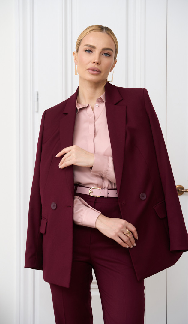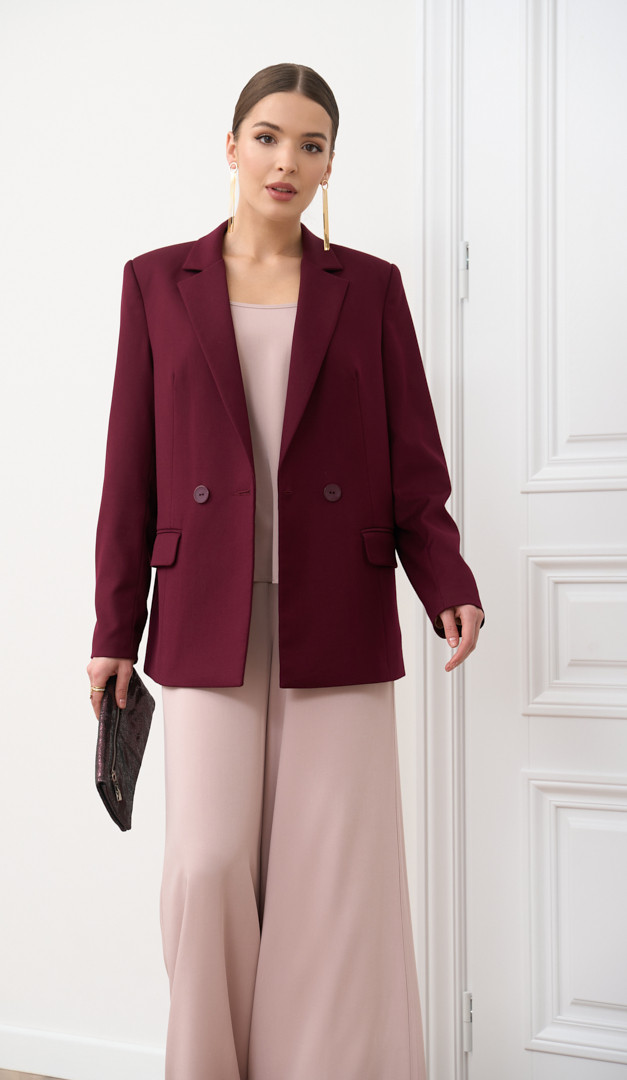 Для створення завершеного та цілісного образу, рекомендуємо жакет комбінувати з брюками жіночими кольору бордо з аналогічної тканини (арт.2844). Також на фото створений образ з штанами палаццо пудровими (арт.2859), топом на тонких бретелях пудровим (арт.2860) та блузкою пудровою (арт.2851).