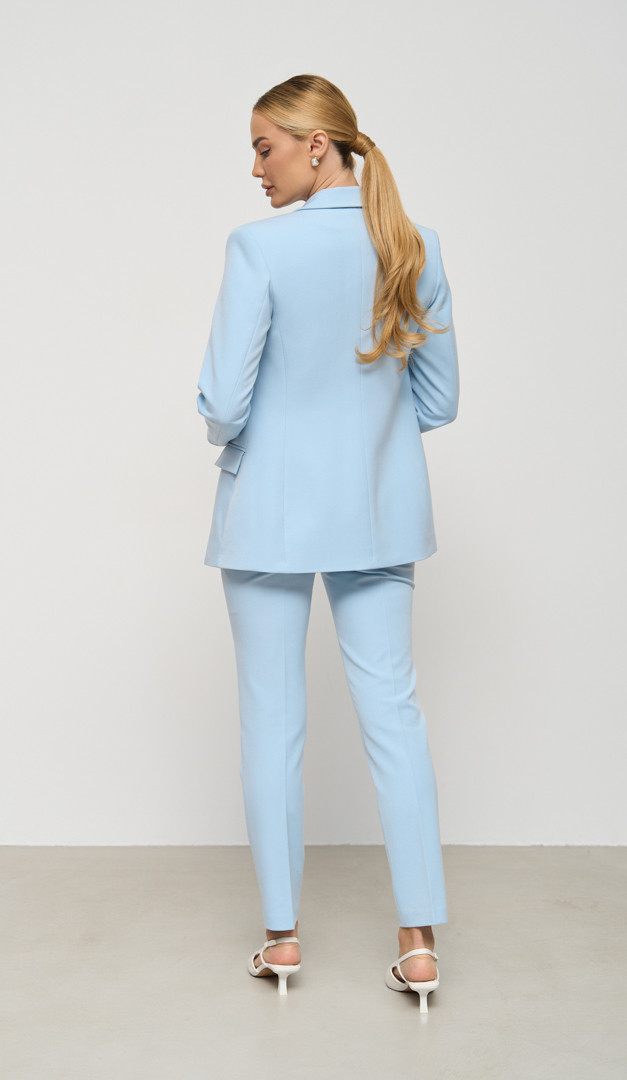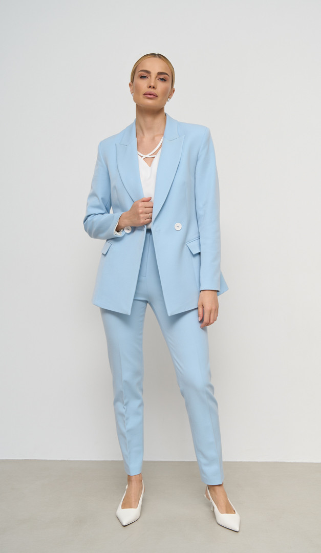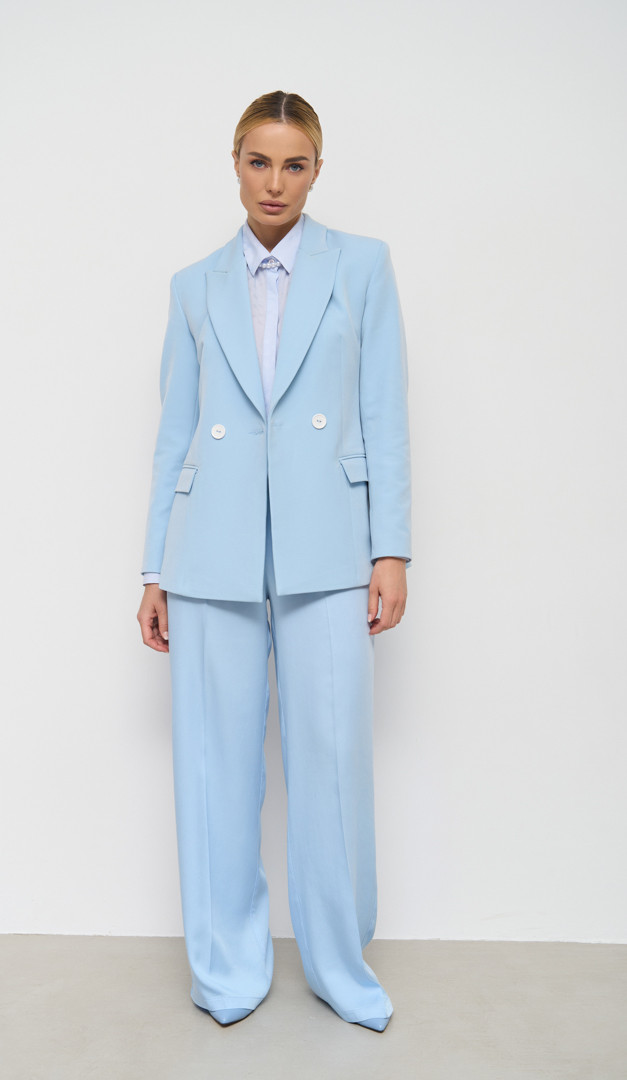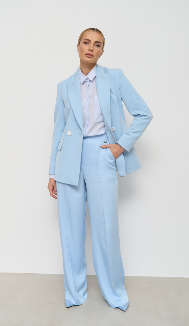 Для створення цілісного монохромного образу, рекомендуємо жакет комбінувати зі спідницею базовою блакитною (арт.2692) і штанами з високою посадкою блакитними (арт.2702 ) з аналогічної тканини.