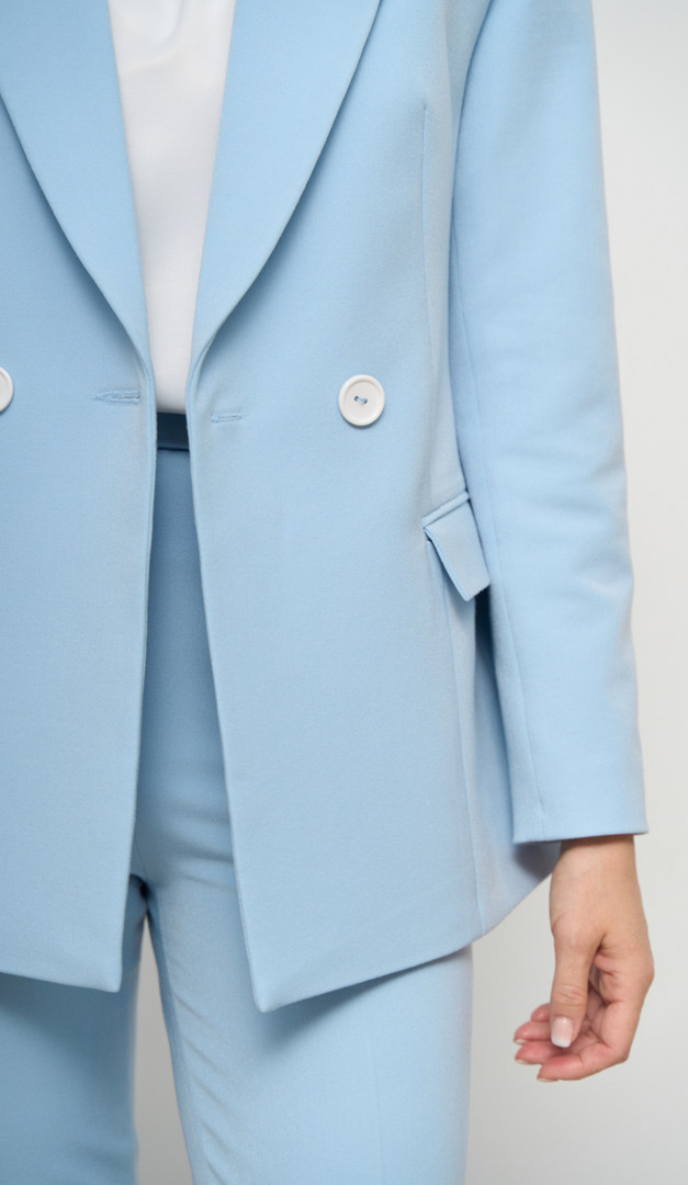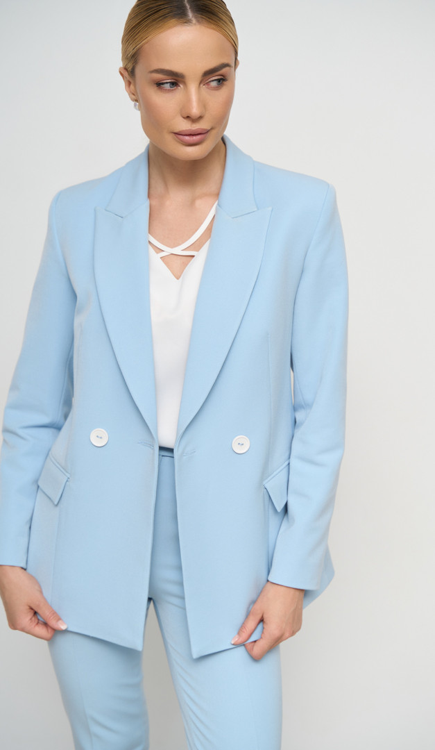 Для стильних весняно-літніх образів універсальною базою стане жакет жіночий двобортний блакитний. Виріб має прямий напіввільний крій, елегантний V-подібний виріз горловини з класичним відкладним коміром і двобортну застібку на ґудзики. Перед жакету жіночого двобортного блакитного доповнений функціональними кишенями з клапанами. З середини модель виконана з підкладкою. Завдяки трендовому кольору жакет стане вдалим доповненням як в класичних, так і в аутфітах у стилі casual.
