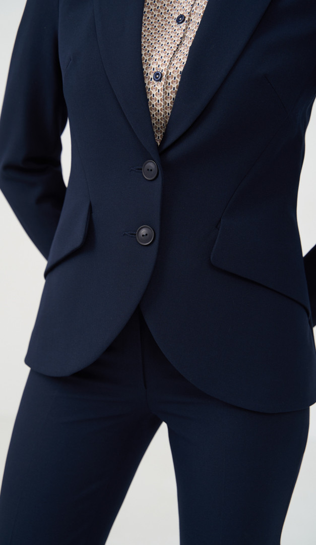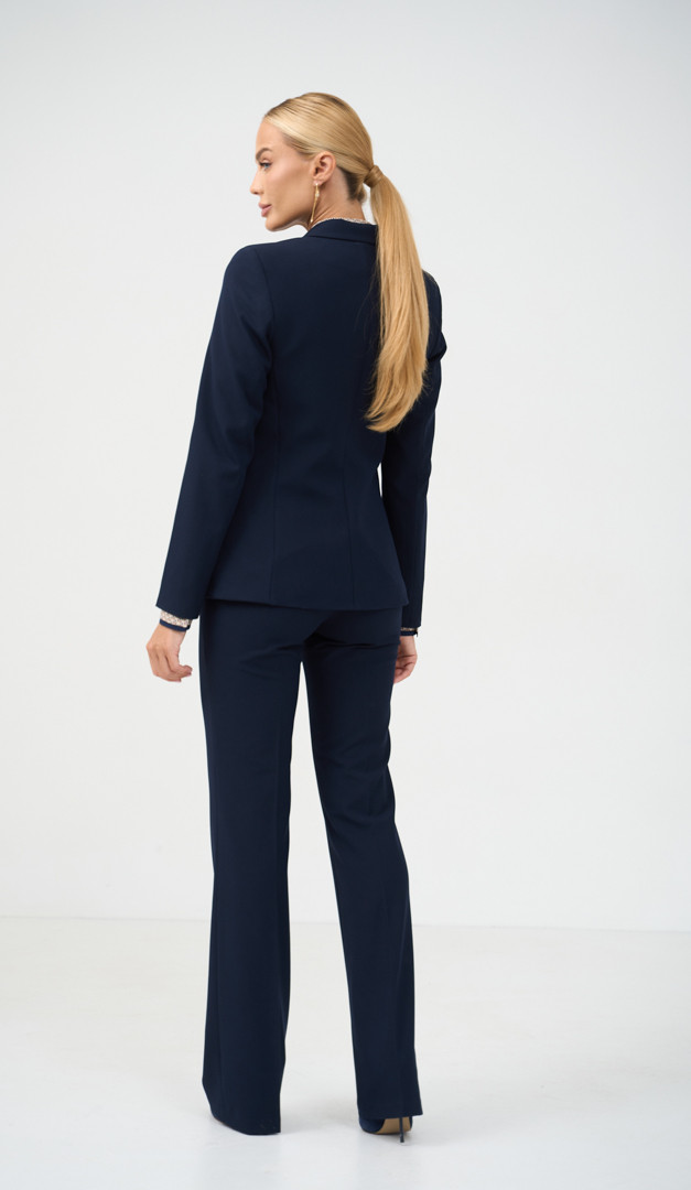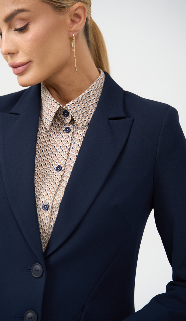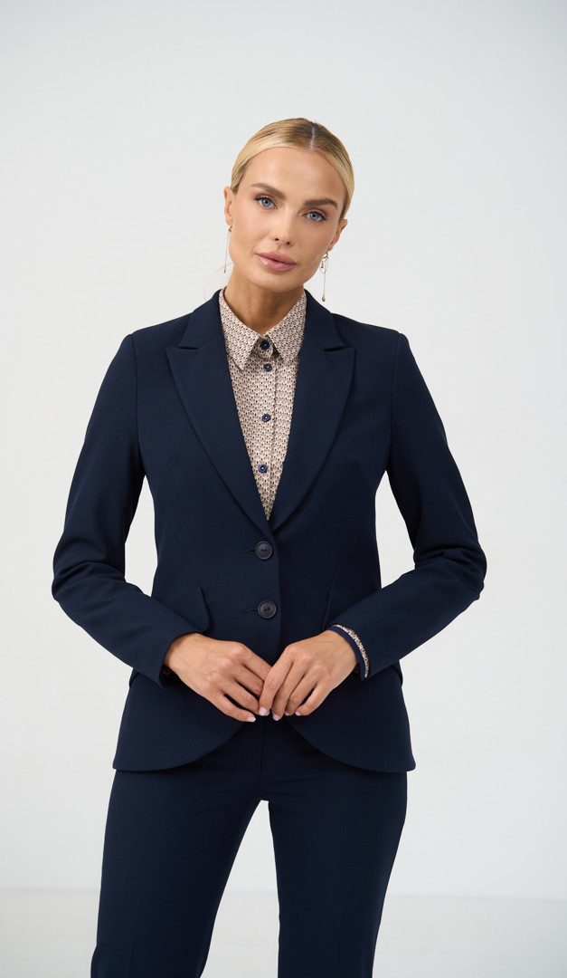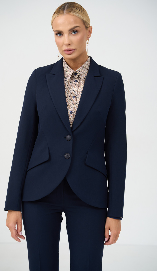 Жакет жіночий класичний синій допоможе створити безліч трендових образів і для роботи, і на кожен день. Модель має прямий вільно лягаючий по фігурі крій і довгий практичний рукав. Дуже елегантно виглядає жакет жіночий класичний синій завдяки поглибленому V-подібному вирізу горловини з фігурними лацканами, що переходить в застібку на 2 ґудзики. Оригінальним виріб роблять декоративні клапани, під якими розташовані внутрішні функціональні кишені та фігурний низ. Модель — на підкладці.
