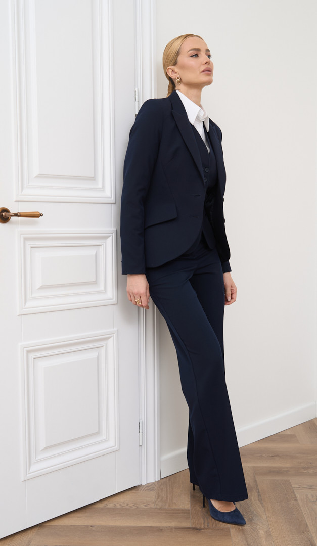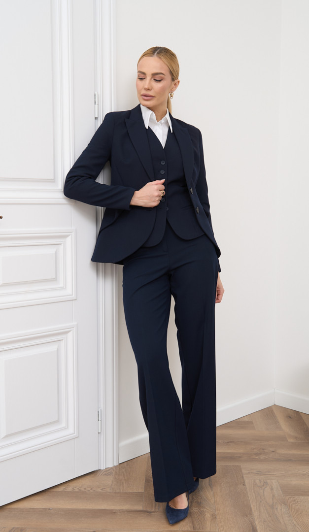 На фото створено образи з жилетом класичним (арт.1922), штанами прямими синіми (арт.2853), блузкою базовою білою (арт.4007) і брюками кльош синіми (арт.1973) та сорочкою з принтом беж (арт.2732).