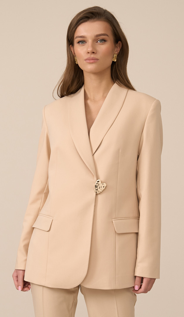 Жакет жіночий вершковий — базовий елемент гардеробу для стильних образів. Виріб має прямий напіввільний крій, елегантний V-подібний виріз горловини з класичним відкладним коміром і зручну застібку на один внутрішній ґудзик та один об'ємний зовнішній ґудзик, який додає моделі виразності. Жакет жіночий вершковий доповнений практичними функціональними кишенями з клапанами. З середини модель виконана з натуральною підкладкою — віскоза 100%.