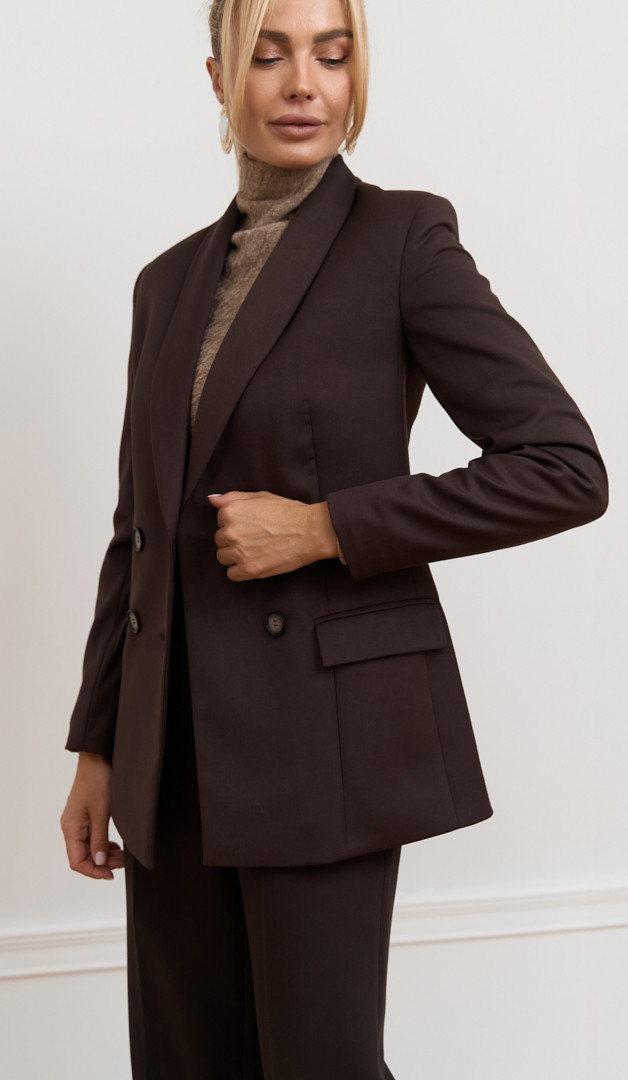 Жакет жіночий шоколадний — стильна базова річ, яка обов'язково повинна бути у Вашому гардеробі! Модель прямого напіввільного крою, з довгим рукавом і неглибоким V-подібним вирізом горловини, який оформлений відкладним коміром. Жакет жіночий шоколадний застібається на двобортну застібку, ґудзики якої гармонійно підібрані до тону виробу. Також модель доповнена практичними прорізними кишенями з клапанами. Жакет на підкладці.