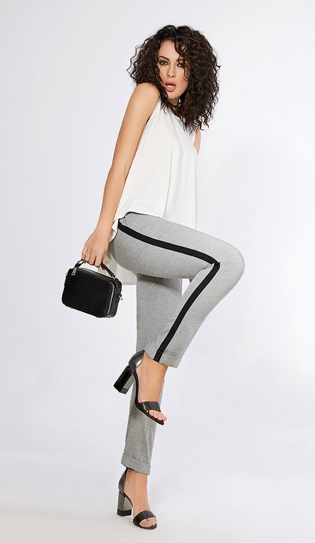 Стильна і практична модель зі 100% віскози на кожен день. Легкі невагомі брюки на резинці ідеально підійдуть і для роботи, і для прогулянок. Виріб має середню посадку по фігурі і прямий звужений крій. Для більшої практичності брюки Росіта з боків доповнені внутрішніми функціональними кишенями. Низ виробу оформлений невеликими вилогами. Головна родзинка брюк — стильні контрастні лампаси, що надають додаткової стрункості силуету. Виріб без застібки на «блискавку».