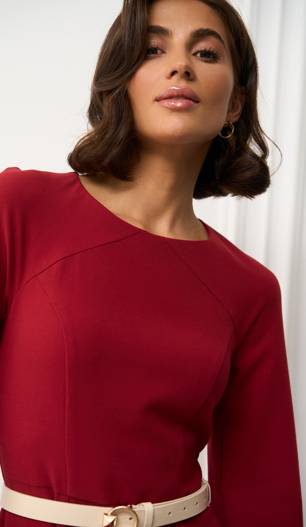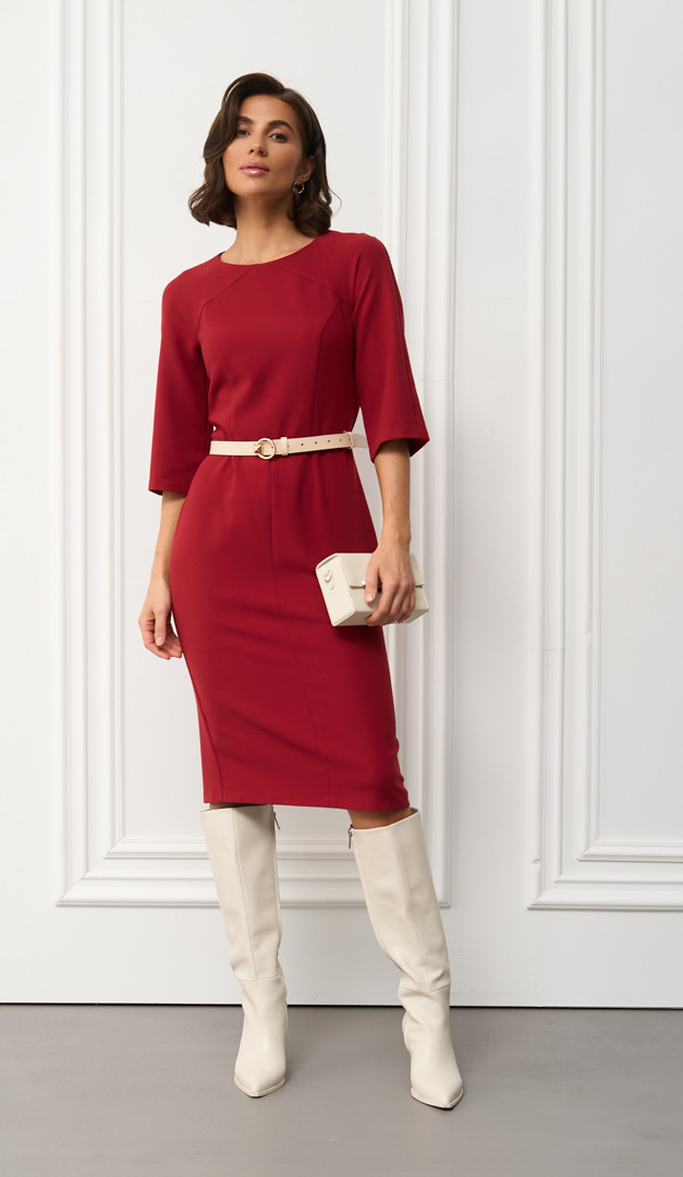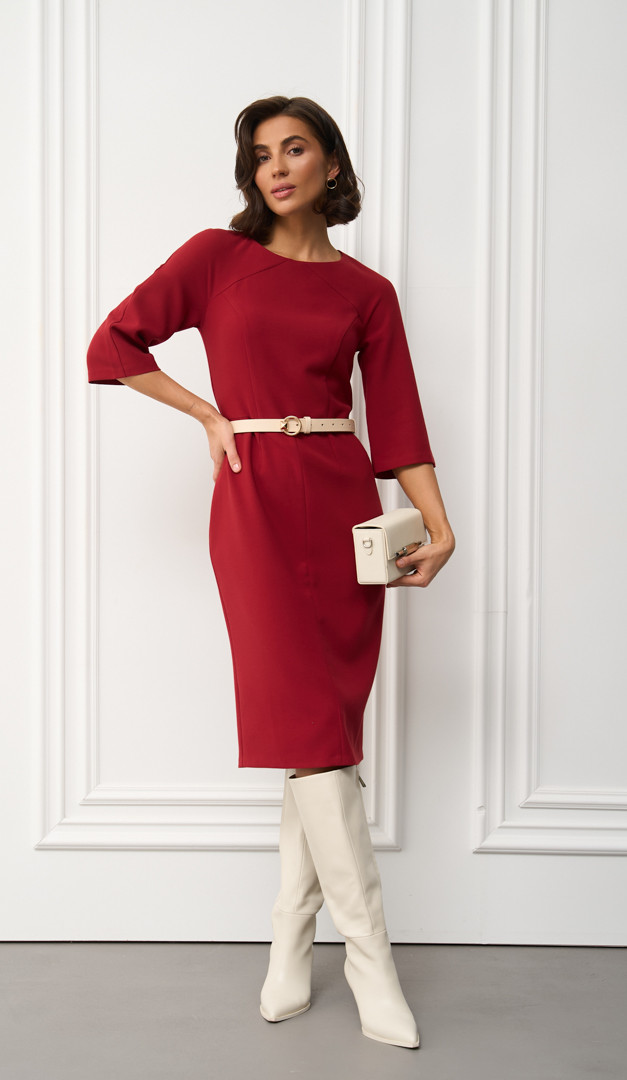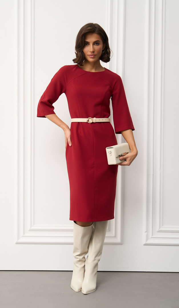 Лаконічна сукня-футляр базова бордо стане практичним рішенням і для вечірнього, і для офісного образів. Завдяки своєму мінімалізму ця модель дає відмінну можливість для різних комбінацій з аксесуарами і взуттям. Сукня-футляр базова бордо виготовлена з м'якої еластичної тканини, яка ідеально лягає по фігурі. Також граційному приляганню сприяє прямий облягаючий крій з відрізною лінією талії. Укорочений рукав форми реглан стильно доповнює перед сукні. Застібається виріб на «блискавку» в середньому шві задньої частини. Низ доповнений акуратною шліцею. Без підкладки.