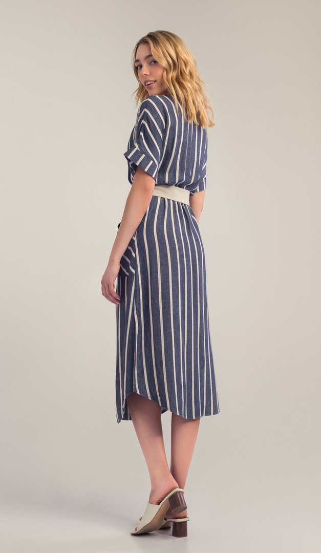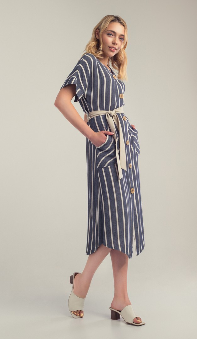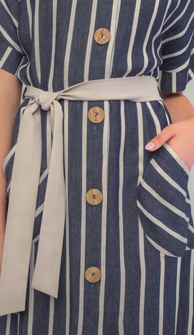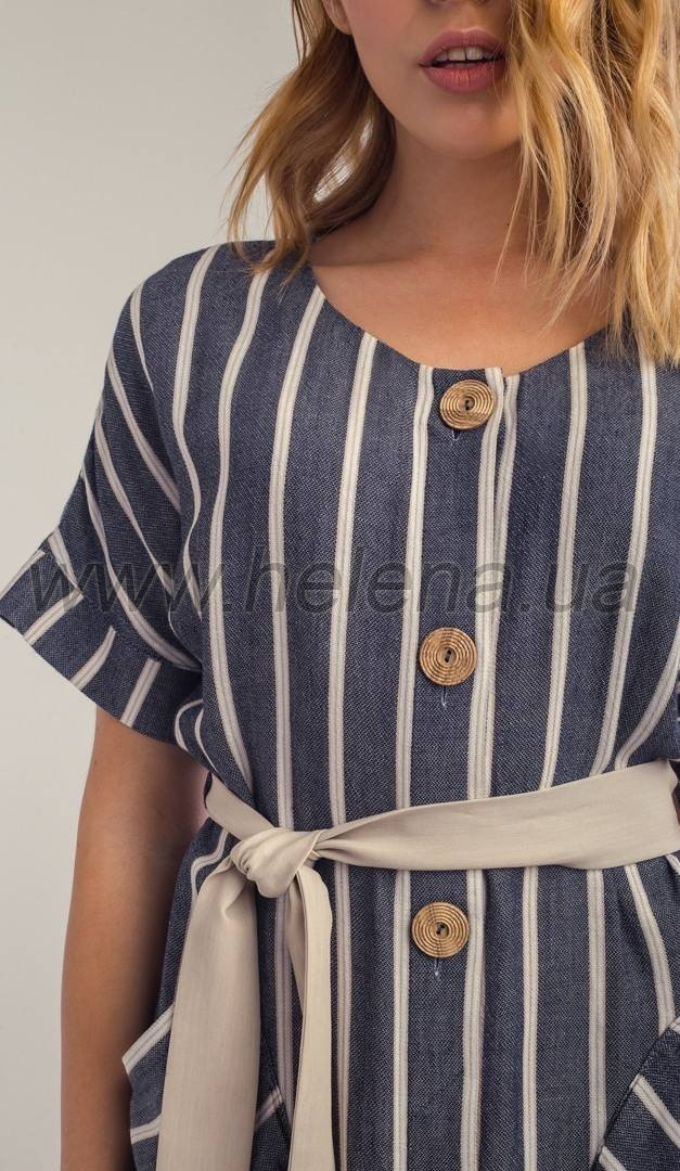 Повсякденне плаття в стилі «денім», яке створене для Вашого комфорту в спекотні дні! Модель має прямий вільний крій з кокетливими бічними розпірками, неглибокий виріз горловини і короткий цільнокроєний рукав. Застібається виріб по центру на ефектні ґудзики, які служать додатковою прикрасою платтю. Виріб також доповнено функціональними накладними кишенями незвичної форми. Завершальний штрих — контрастний пояс з тканини, що робить акцент на талії.