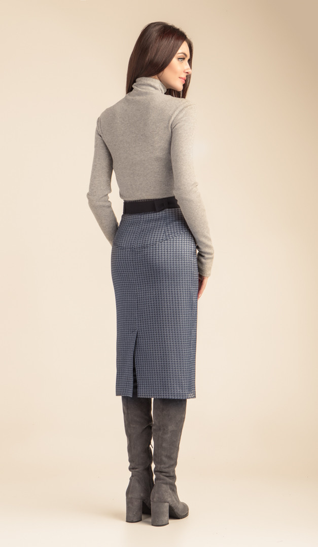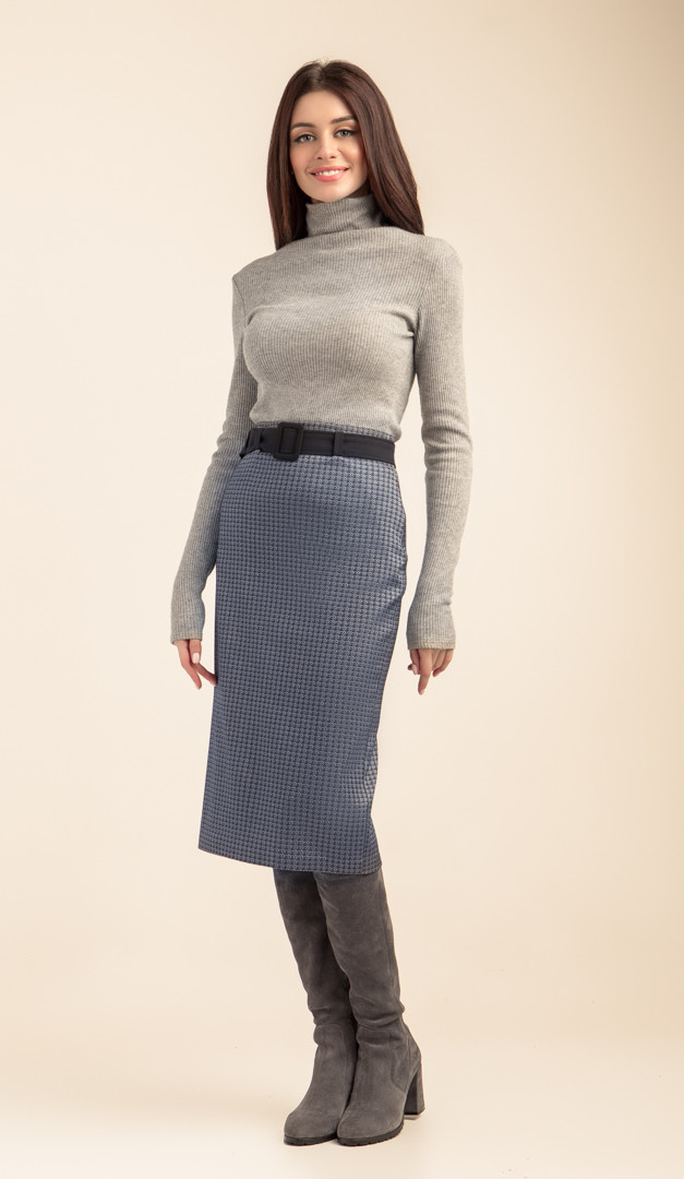 Класична спідниця-олівець, яка зробить ділової образ більш елегантним, а силует - струнким і витонченим. Спідниця міді з ременем синя, виконана з еластичного оригінального матеріалу, має облягаючий крій і зручну середню посадку по талії. Верх виробу доповнений знімним поясом з контрастної тканини. В середньому шві заднього полотнища розташована невелика акуратна розпірка. Спідниця міді з ременем синя не має застібок, фіксується на талії за допомогою широкої резинки, яка розташована всередині. На підкладці.