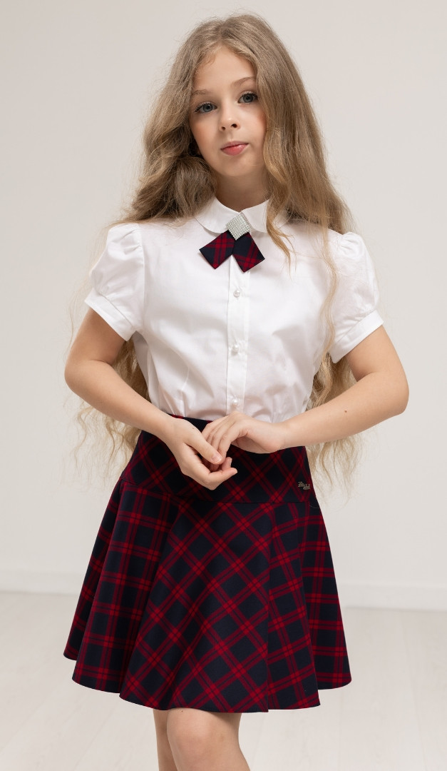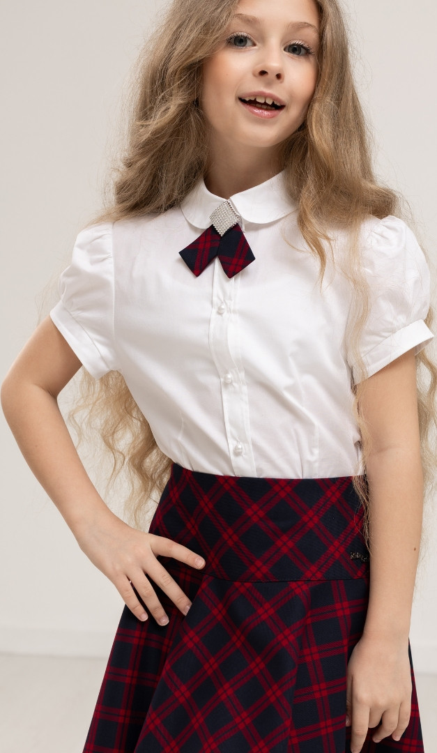 Біла блузка для дівчинки з брошкою, виконана з 95% бавовни, стильно доповнить класичний і повсякденний гардероб модної школярки! Біла блузка має комфортний прямий напівприлеглий крій. Горловина оформлена акуратним відкладним коміром зі знімною брошкою в патріотичному стилі. Короткі рукави кокетливої форми «ліхтарик» по низу доповнені тонкою манжетою.