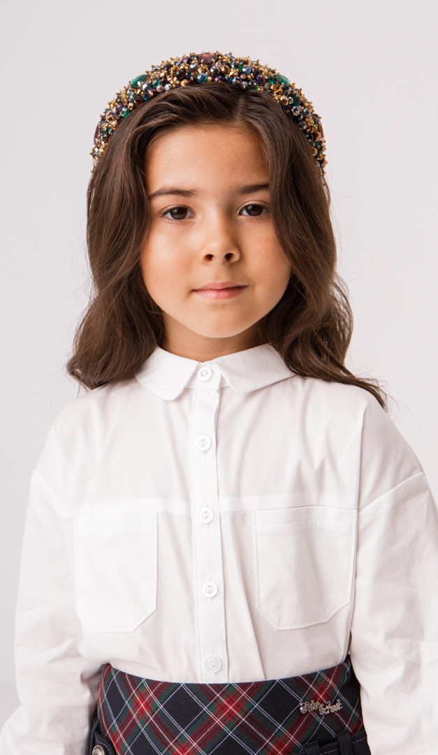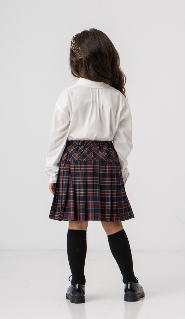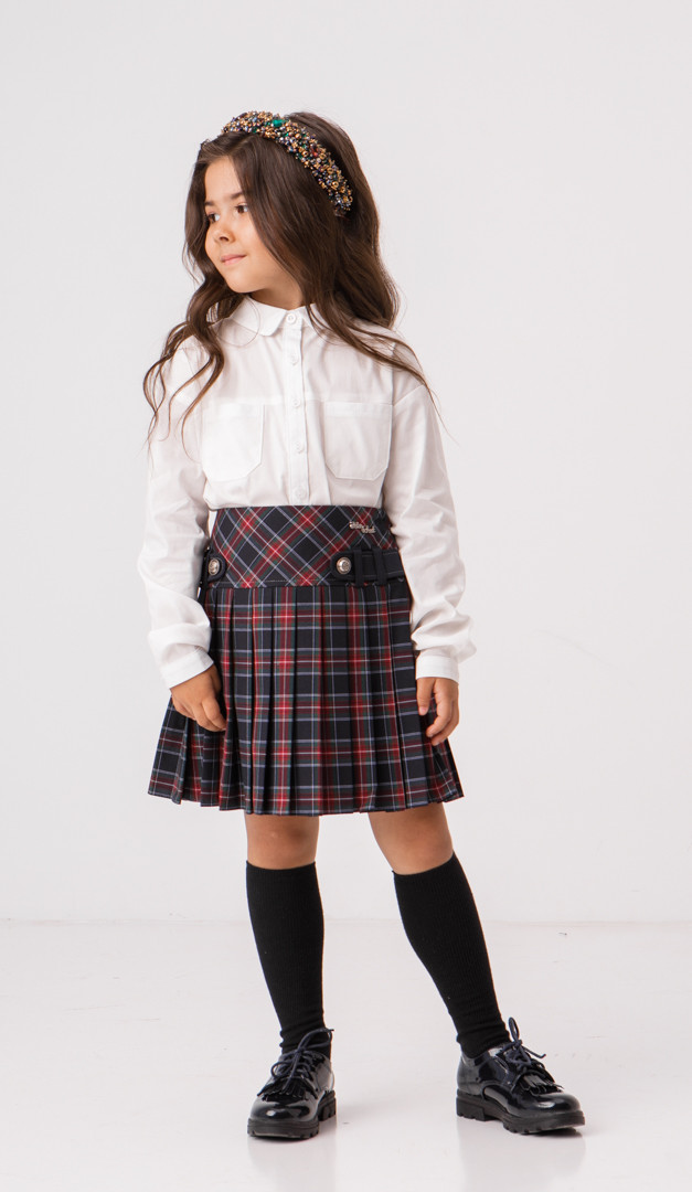 Блузка-сорочка для дівчинки стане не тільки базовою, а й улюбленою річчю гардероба модної школярки. Вона виготовлена з приємного на дотик матеріалу, а також має зручний і практичний крій. Виріз горловини оформлений акуратним відкладним коміром на стійці, що плавно переходить в центральну застібку на ґудзики. Блузка-сорочка для дівчинки має класичний стриманий дизайн, спереду оформлений кокеткою і функціональними накладними кишенями. Довгий прямий рукав по низу оформлений витонченою манжетою із застібкою на один ґудзик. Спинка блузки-сорочки стильно прикрашена чотирма невеликими защипами. Низ моделі — злегка округлої форми.