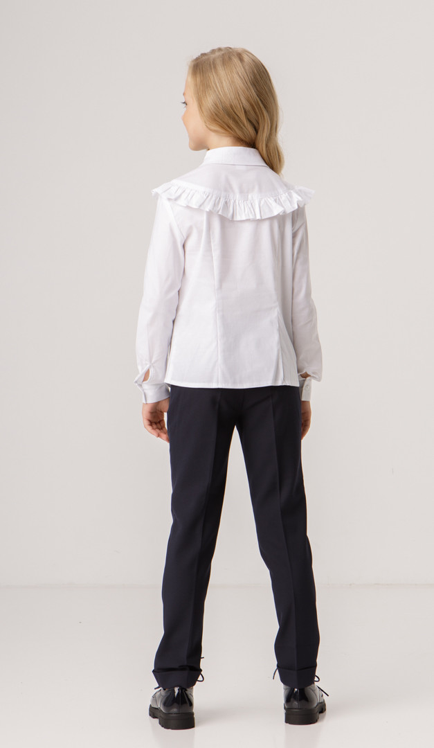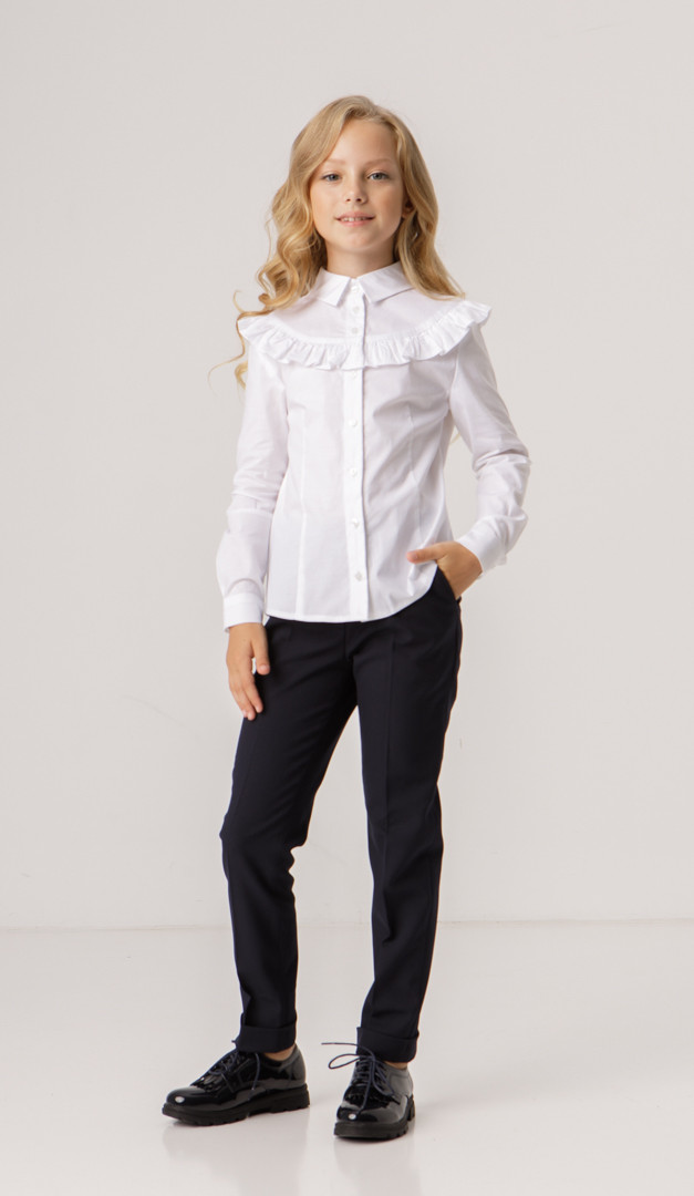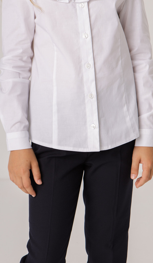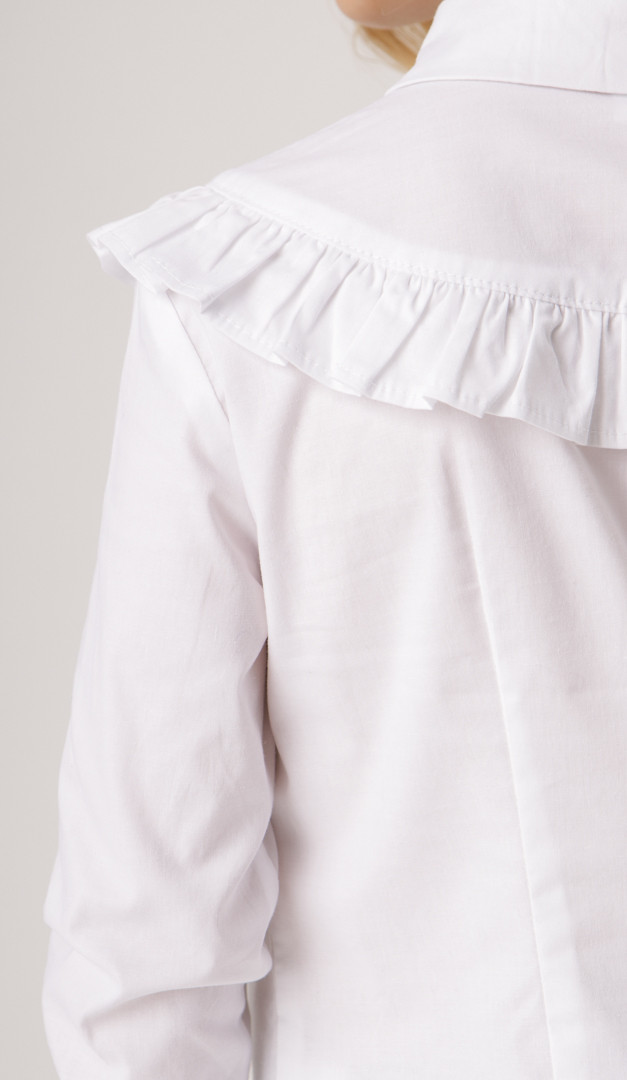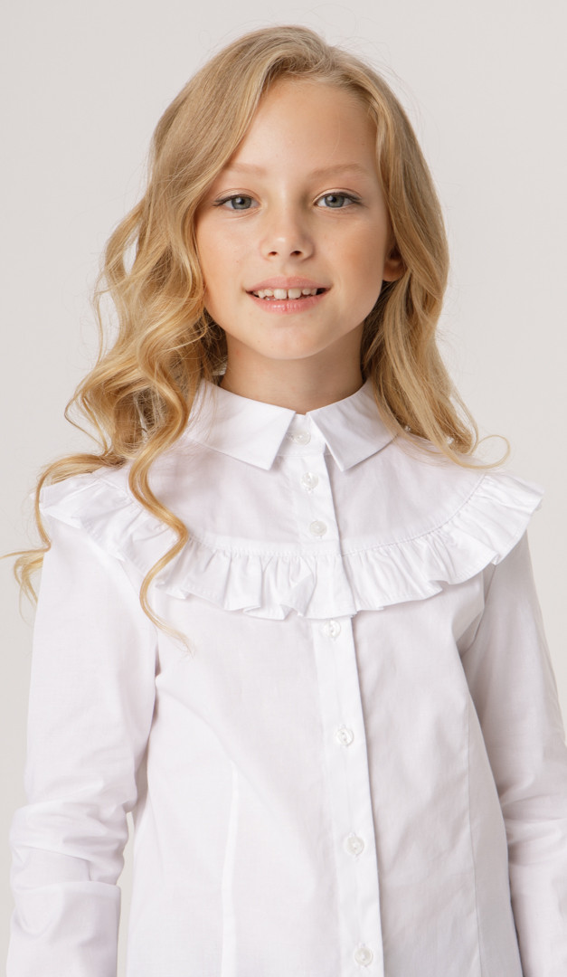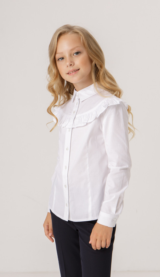 Блузка біла з рюшею для дівчинки — святкова і в той же час дуже комфортна модель, виготовлена з бавовни. Модель має зручний прилеглий крій, тому саме ця блузка з рюшею гармонійно буде комбінуватися з жакетом або жилетом. Горловина оформлена акуратним відкладним коміром на стійці, перехідним в планку, що застібається на ґудзики. Головний акцент цієї блузки — це невелика кокетка, прикрашена чарівною рюшею. Довгий рукав доповнений нешироким манжетом, що застібається на ґудзик.
