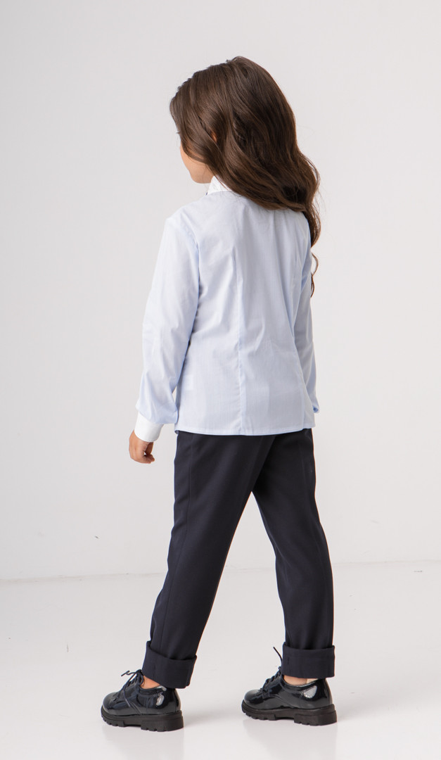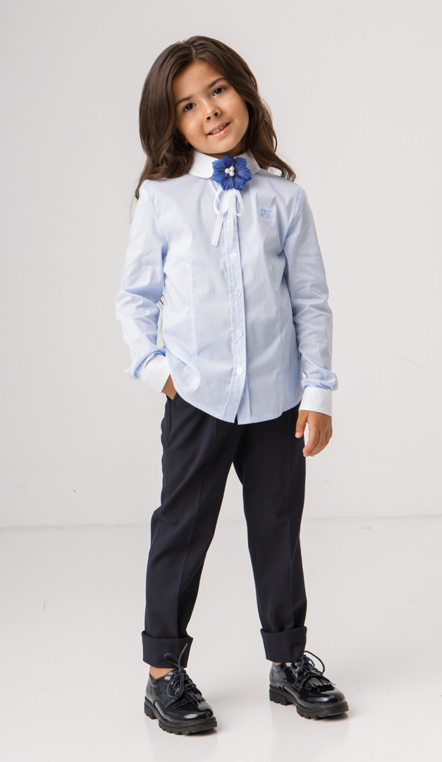 Блузка блакитна в полоску для дівчинки внесе різноманітність в будь-який шкільний образ, зробивши його красивим і ошатним! У цій моделі оригінально підібрані два кольори тканини, тому акуратний відкладний комір і не великі манжети виглядають дуже стильно і гармонійно. По центру блузки розташована планка, що застібається на ґудзики, а верх її прикрашений чарівною знімною квіткою-прикрасою з тасьмою.