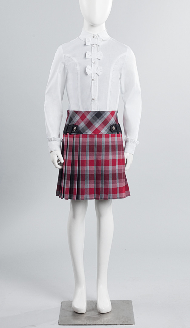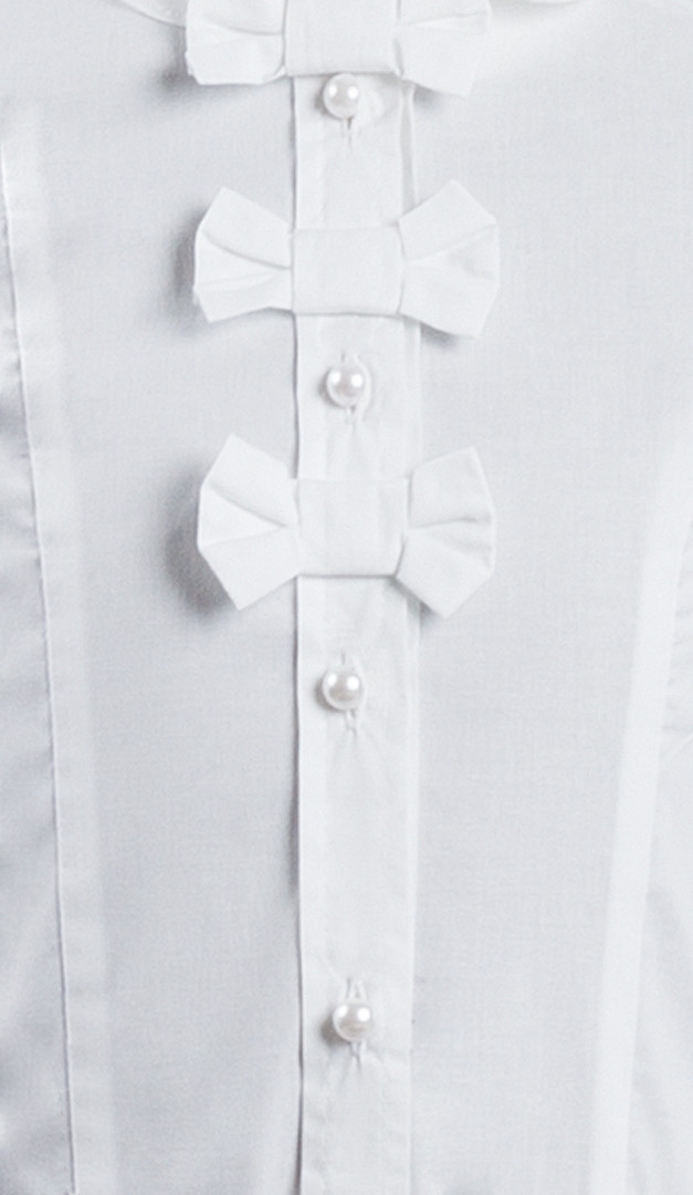 Кокетлива блуза для дівчаток Мілашка. Ця модель має ретельно продуманий прилеглий (за рахунок фігурних рельєфів) силует, що дуже зручно для комбінування і з сарафаном, і з жакетом. Миловидності і особливої нарядності блузі надають декоративні бантики, розташовані по центру. Також модель має класичний комір на стійці з закругленими краями, що переходить в планку, яка застібається на витончені ґудзики. Довгий напівприлеглий рукав по низу доповнений манжетою із застібкою на ґудзик і симпатичною рюшею.