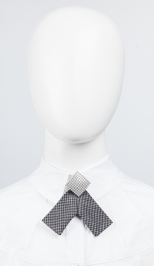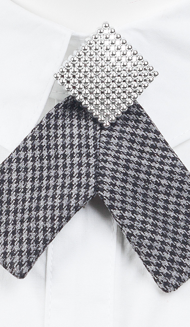 Оригінальний штрих класичного образу — це елегантний знімний бантик. Цей аксесуар по центру доповнений ефектною брошкою, яка пристібається.
